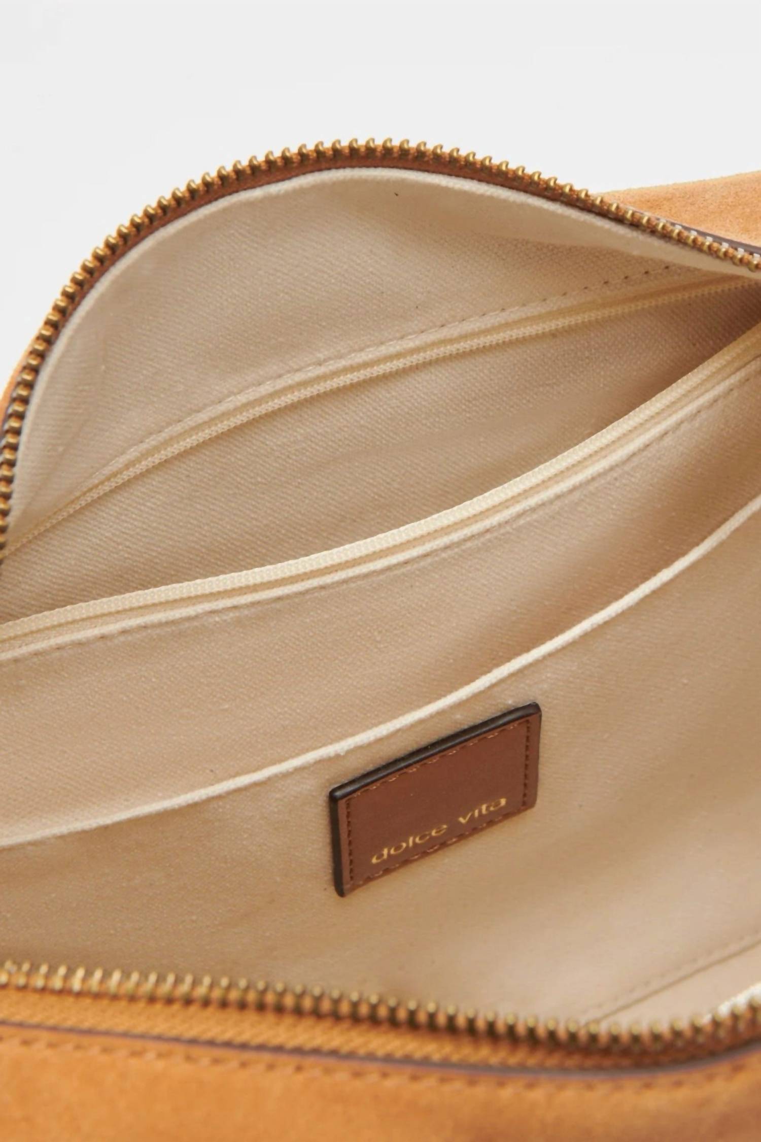Elevate your accessory collection with the Women's Hana Hobo Shoulder Bag by Dolce Vita in luxurious Rusty Oak suede. Designed for versatility, this spacious bag features an adjustable handle with a 12" drop, a top zipper closure, and ample storage with one exterior slip pocket and three interior pockets. The chic blend of style and practicality makes it ideal for transitioning from day to night. Dimensions are 12" in height, 13.5" in width, and 5.5" in depth; imported for quality authenticity.