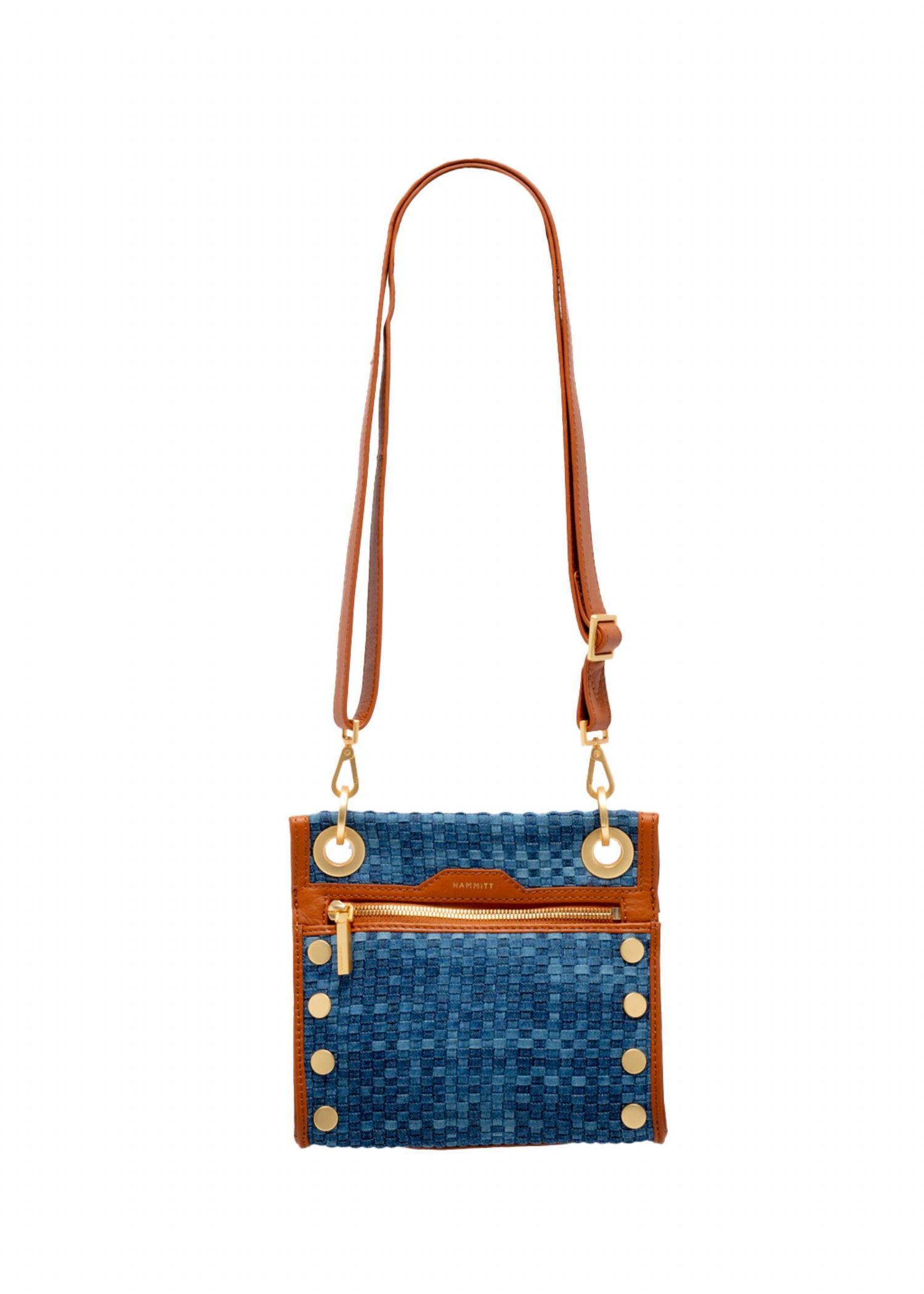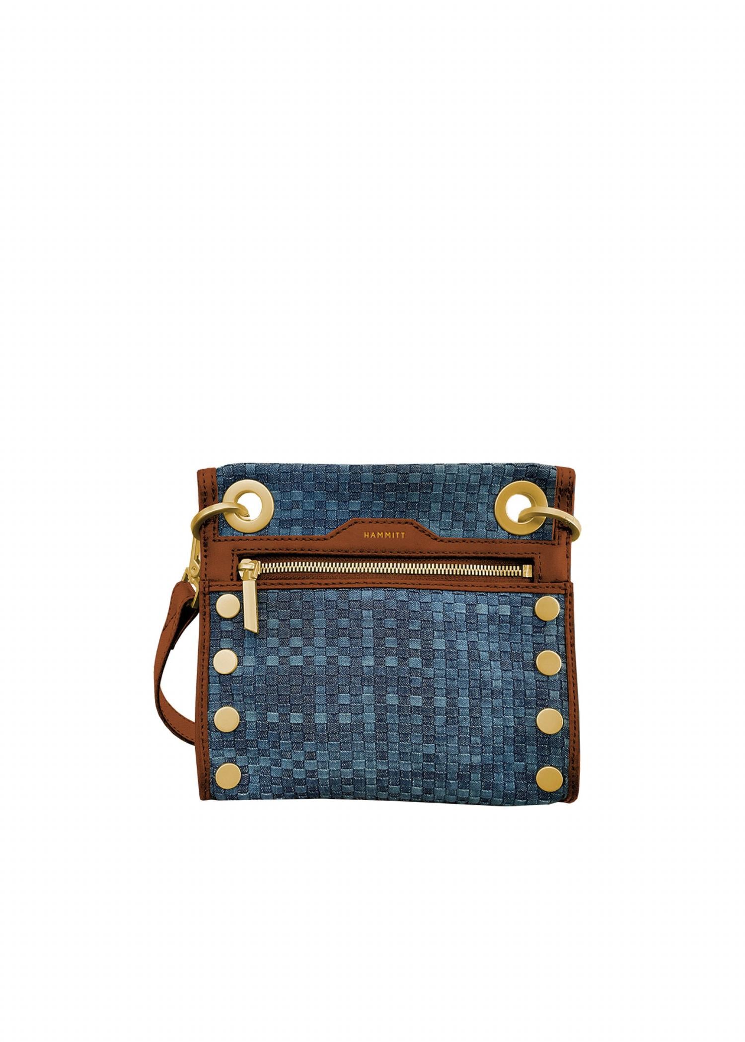 Introducing the Women's Tony Small Bag by Hammitt, a stylish blend of functionality and fashion. Featuring a denim weave in Mosaic Denim/Brushed Gold, this crossbody bag comes with an adjustable strap and a convenient cell phone pocket. Its dimensions are 8 inches in width, 2 inches in depth, and 7.5 inches in height, making it a compact yet spacious option. With a single zippered compartment, this bag is perfect for keeping your essentials organized.