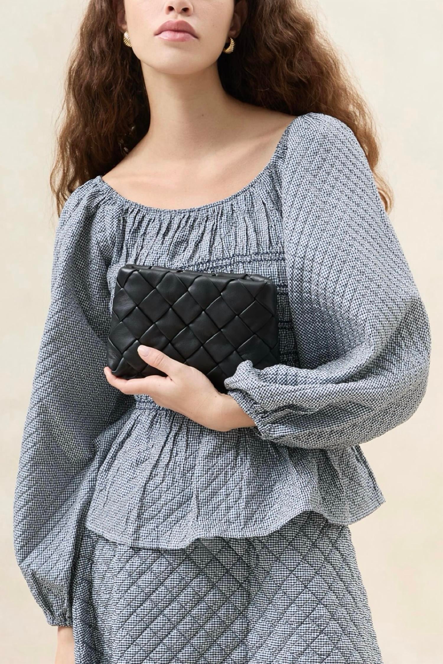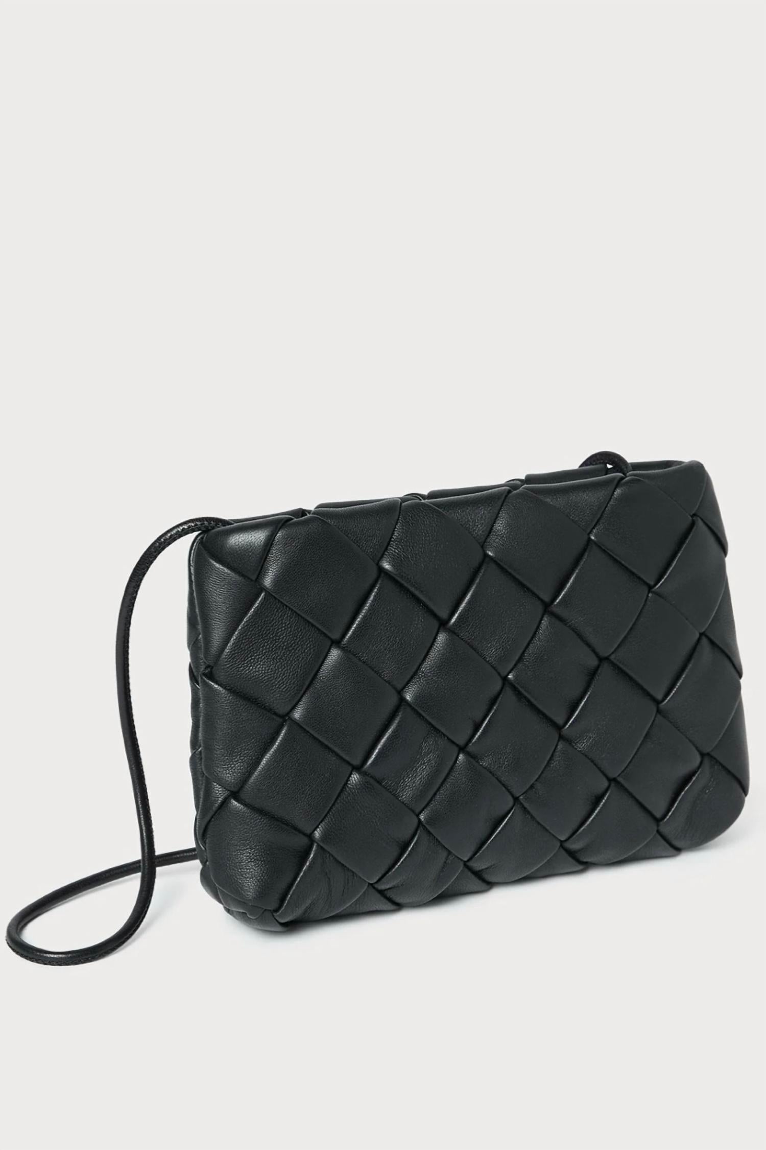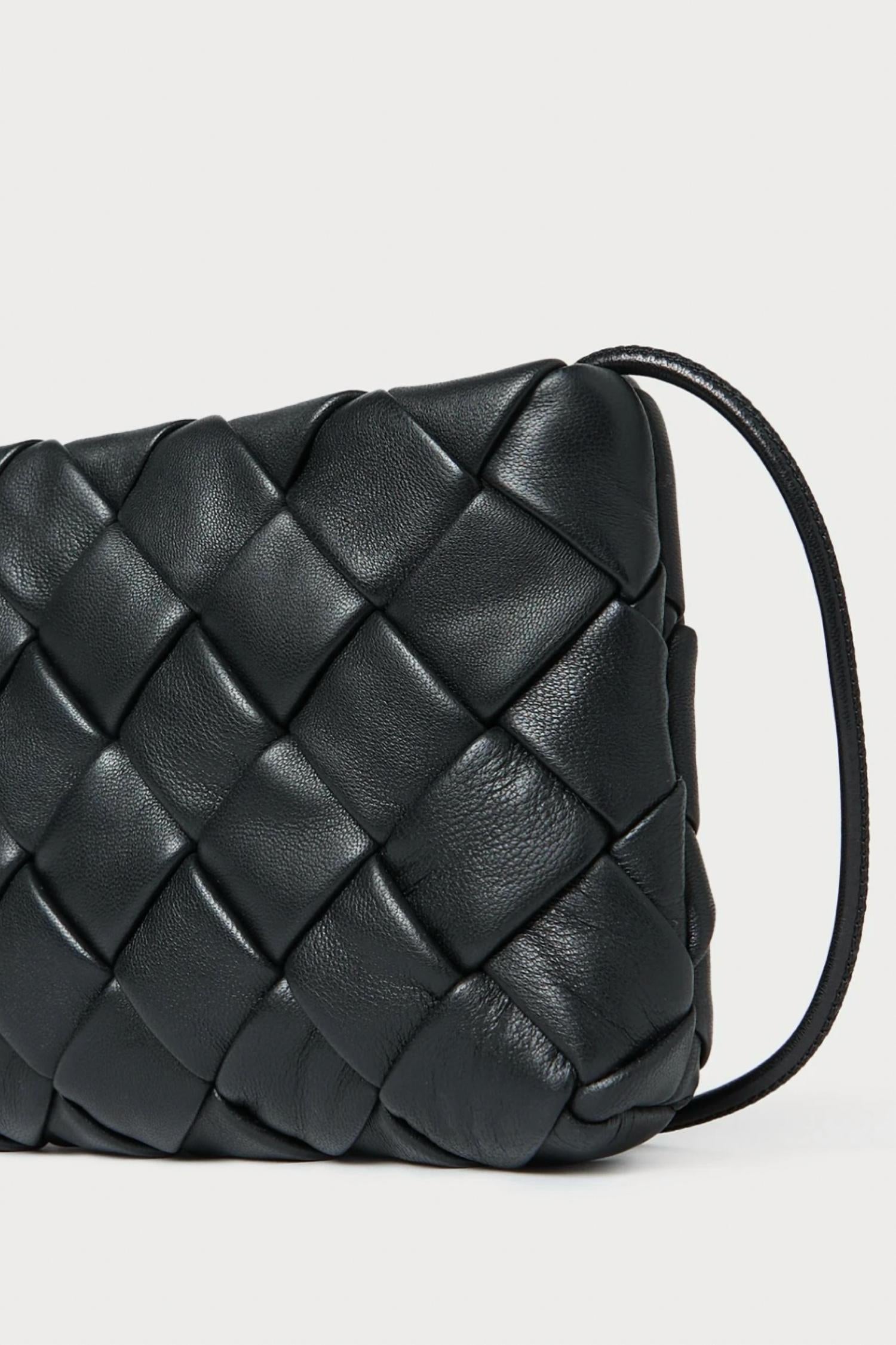 Discover the Women's Mini Auzeen Woven Shoulder Bag by Loeffler Randall, an exquisite piece crafted from 100% woven lamb leather in a timeless black hue. This elegant mini shoulder bag features a convenient magnet closure and a removable tonal strap, making it a versatile accessory. Dimensions: Width 9.25", Depth 1.5", Height 5". For optimal care, avoid exposure to water and consult a leather professional for cleaning, but be mindful of potential color transfer with normal wear.