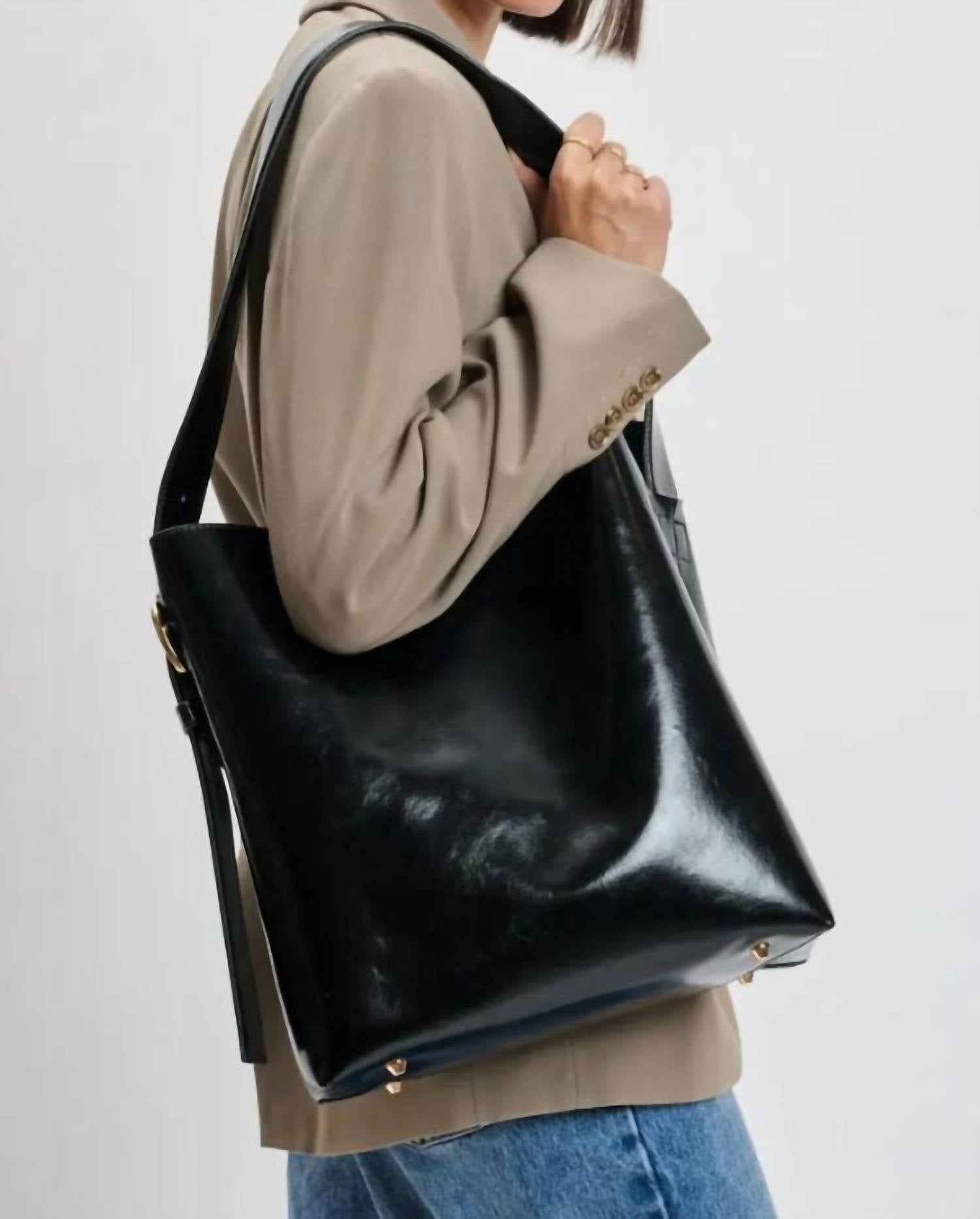 The Brooke Bucket Bag by Mint is your chic companion in a rich Burgundy hue, crafted from ethical vegan leather with a stylish bucket-style shape. Featuring practical gold hardware and an interior zip pocket, this tote is as functional as it is fashionable. The top snap closure secures your essentials, while its generous dimensions of 12.6 x 5.1 x 13.3 inches (32 x 13 x 33.8 cm) make it perfect for all your daily needs or as a sleek overnighter. Ideal for pairing with corduroy or denim and your favorite fall blouse.
