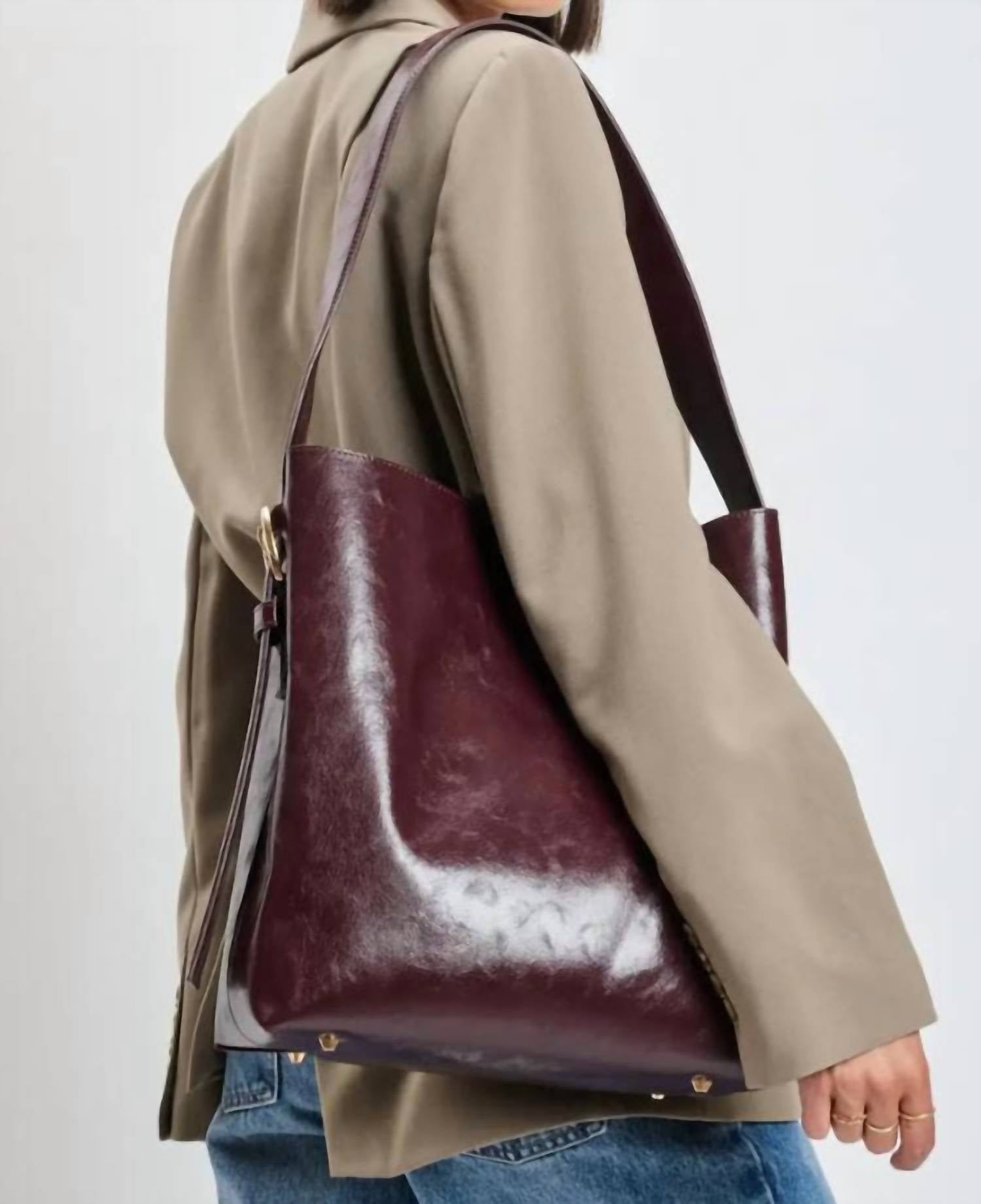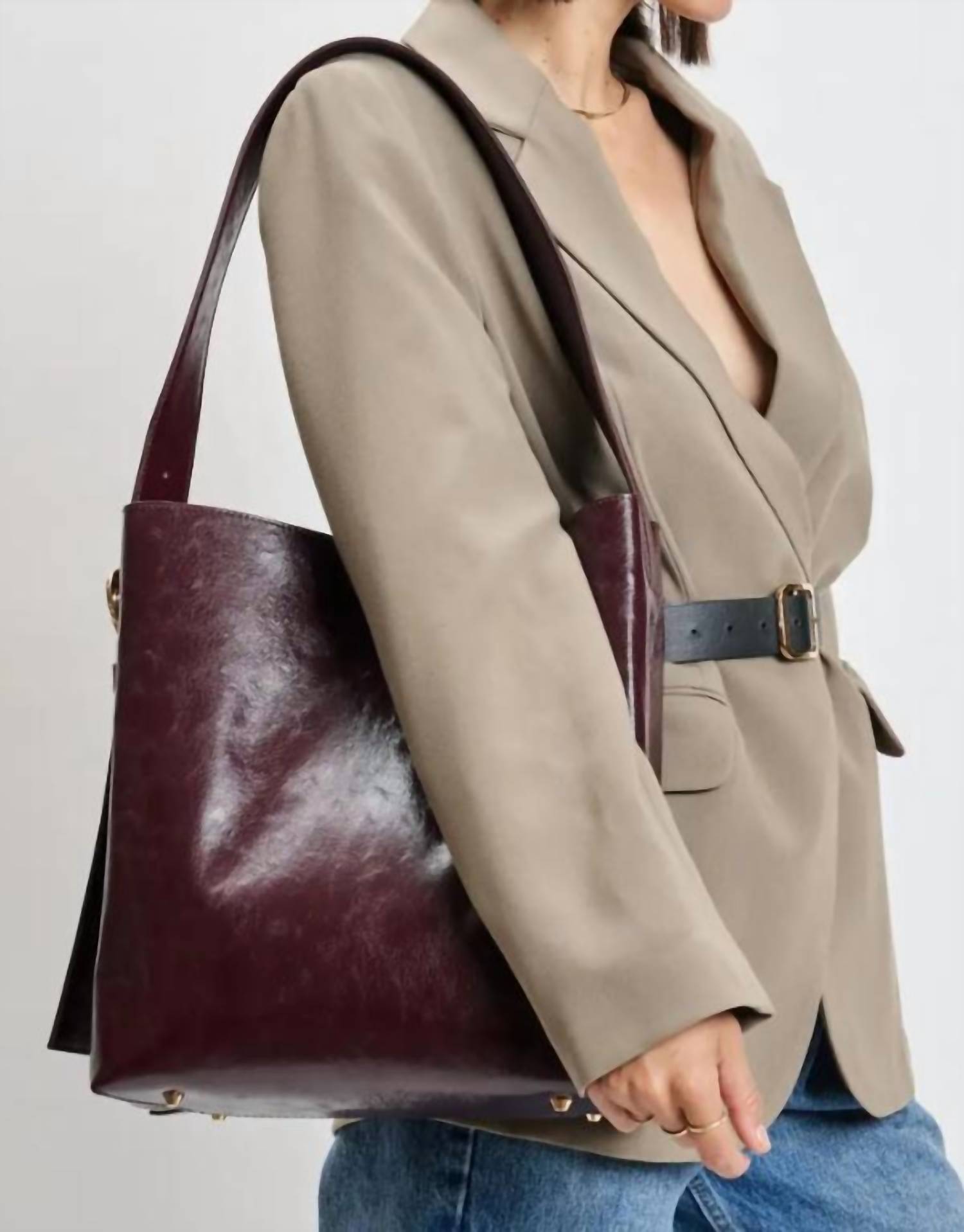 The Brooke Bucket Bag by Mint is your chic companion in a rich Burgundy hue, crafted from ethical vegan leather with a stylish bucket-style shape. Featuring practical gold hardware and an interior zip pocket, this tote is as functional as it is fashionable. The top snap closure secures your essentials, while its generous dimensions of 12.6 x 5.1 x 13.3 inches (32 x 13 x 33.8 cm) make it perfect for all your daily needs or as a sleek overnighter. Ideal for pairing with corduroy or denim and your favorite fall blouse.
