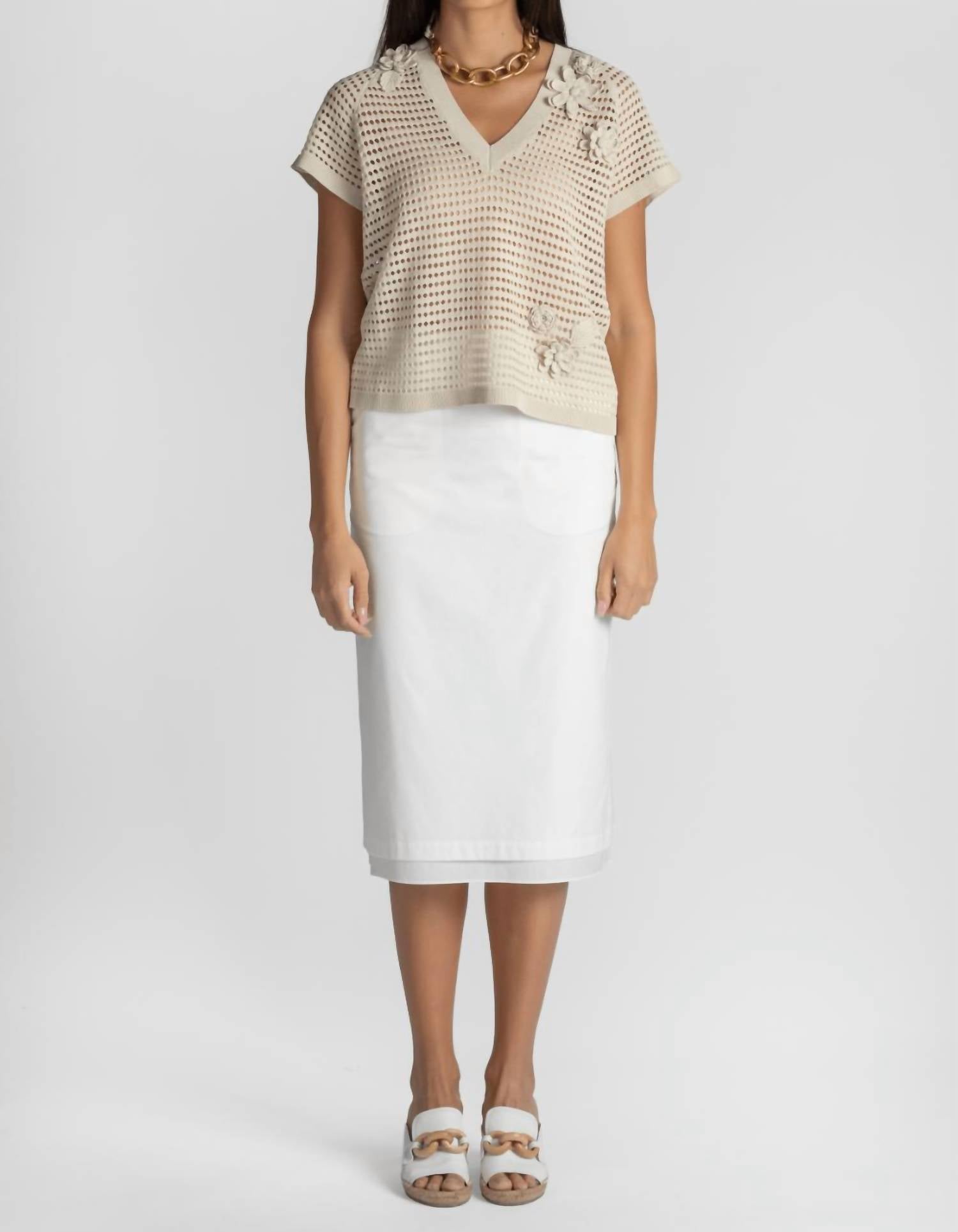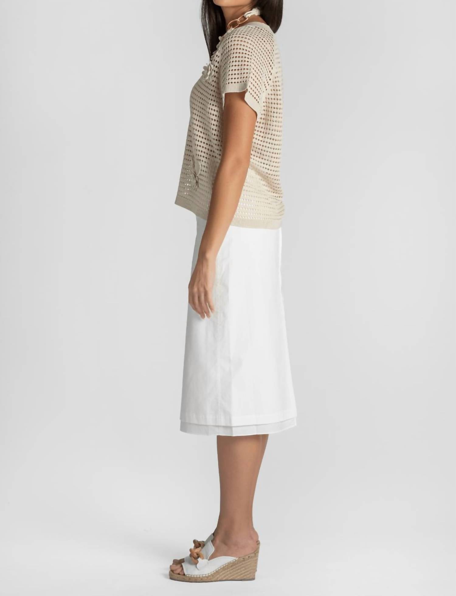 An easy yet feminine skirt to pair with a tee for a more casual vibe, or dress it up with a nice blouse and wedges. Introducing the Dutton Poplin Midi Skirt by Saint Art, a minimalist white skirt that exudes elegance. With a solid pattern, this circle and skater skirt is crafted from a soft, crisp cotton blend, providing both comfort and style perfect for spring occasions like a dinner party. It features a relaxed midi length and a convenient zip closure for ease of wear. For care, machine wash and lay flat to dry. The model wears a size small, standing 5'8" tall and typically wearing a US size 4.