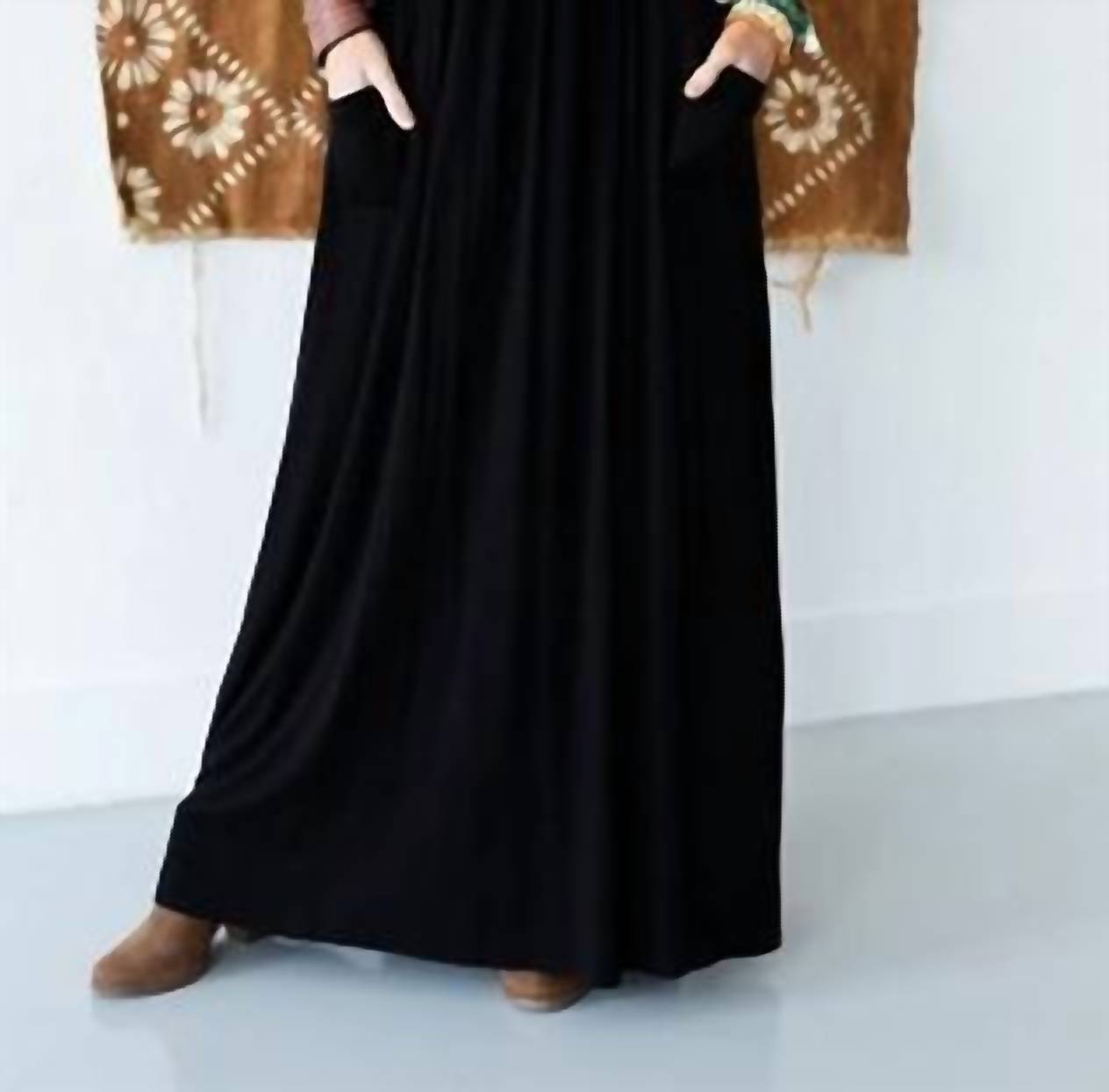 An easy yet feminine skirt to pair with a tee for a more casual vibe, or dress it up with a nice blouse and wedges. The perfect black maxi skirt with pockets. Elastic waist.