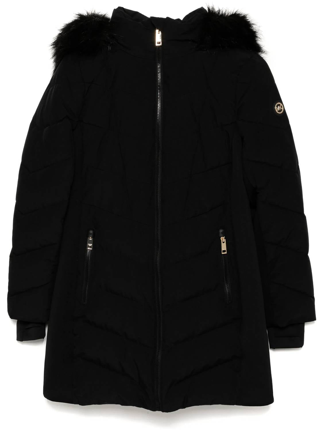 cooler temps means even cooler jackets and this stylish number doesn't dissapoint. Introducing the Chevron Scuba Coat by Michael Michael Kors, crafted for the modern woman who embraces both style and function. This long sleeve coat in classic black is made from water-resistant polyester and features a sleek chevron design for a flattering fit. It includes a removable hood with black faux fur trim for added versatility and style. With its zip closure, this winter wardrobe staple is imported from the USA and requires dry cleaning to maintain its monochrome elegance. Perfect for travel or a chic Thanksgiving outing.