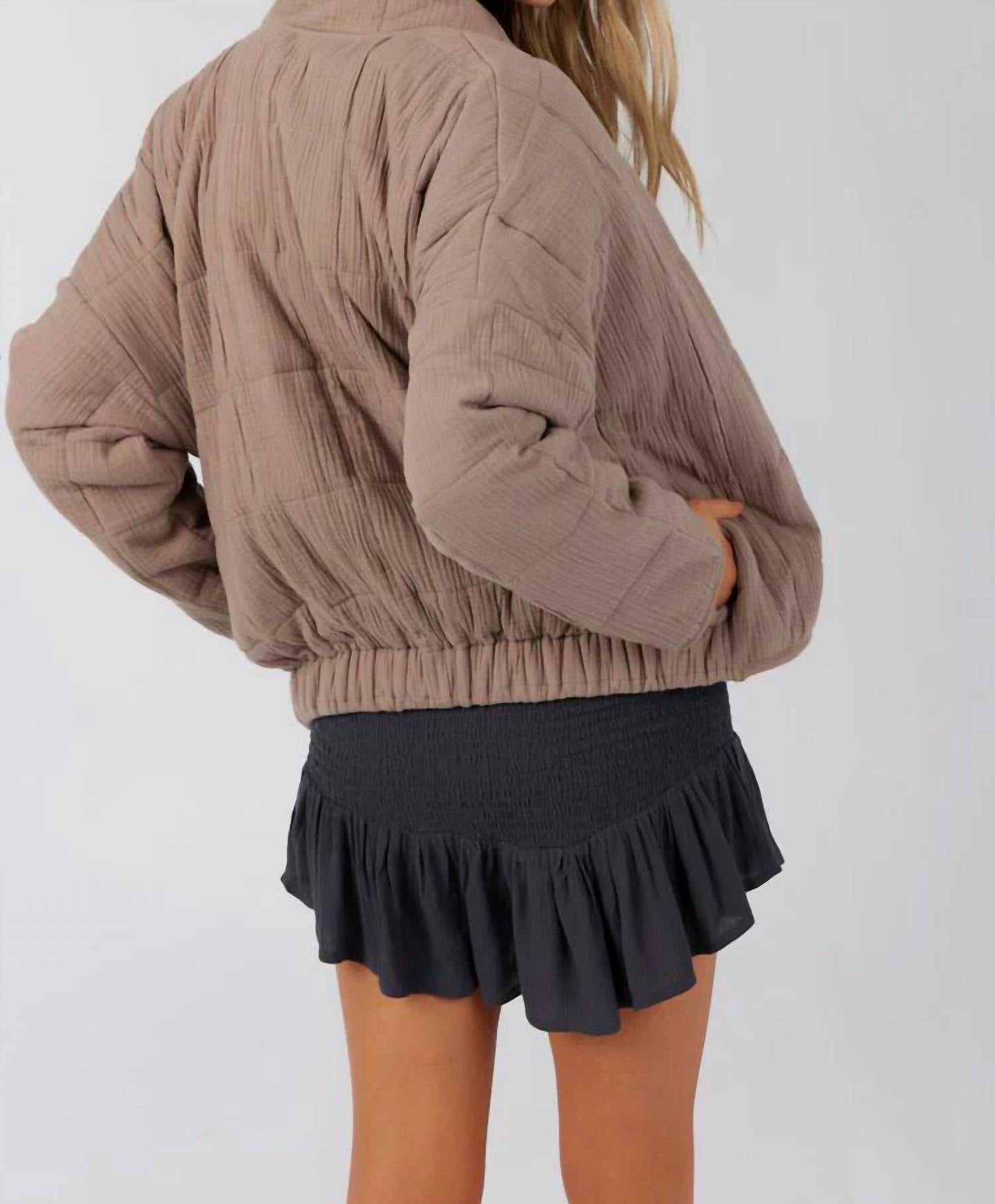 cooler temps means even cooler jackets and this stylish number doesn't dissapoint. Meet the Mabeline Jacket by O'Neill, a stylish and cozy choice for colder days. This oversized textured taupe jacket features long sleeves and is crafted from 100% cotton double gauze fabrication for lightweight warmth. With a practical 24-inch length, high-neck collar, and a combination of front zipper and snap closure, it is fully lined and includes on-seam pockets with an elastic back hem. Perfect for winter streetwear and camping, it combines functionality and style effortlessly.