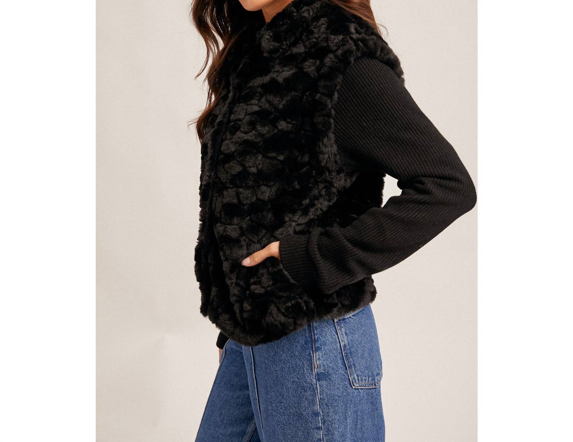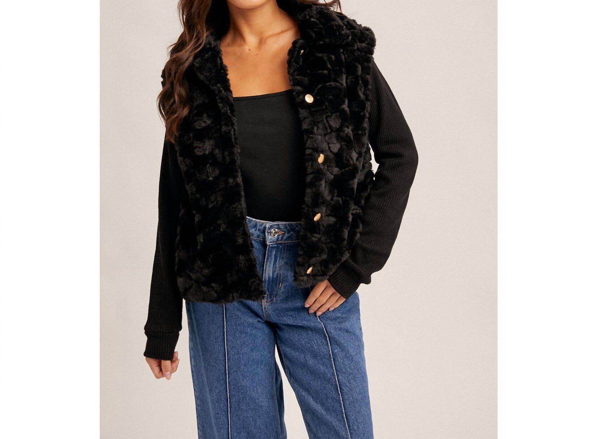 cooler temps means even cooler jackets and this stylish number doesn't dissapoint. Elevate your winter wardrobe with the Hem & Thread Knit Sleeve Fur Jacket, a luxurious addition perfect for vacation getaways. This ecru women's jacket features long sleeves and a textured design made from sumptuous faux fur. The jacket offers a sleek button closure, complete with practical pockets for added convenience. Care for this stylish piece by dry cleaning to maintain its pristine condition.