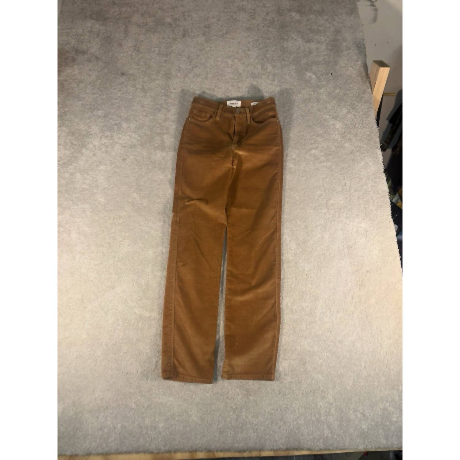 Everyone needs a good pair of skinny jeans and this is a style you'll keep reaching for no matter the season. Elevate your denim collection with the Le Sylvie High Rise Straight Corduroy Jean by FRAME, crafted in a chic brown color. These jeans feature a flattering high rise and a slim fit through the hip, complemented by a straight leg style for a classic silhouette. Made from a sustainable cotton blend, they offer ultra-soft and comfortable wear, enhanced with a practical zip closure and functional pockets. This minimalist and versatile piece is machine washable and can be tumble dried.