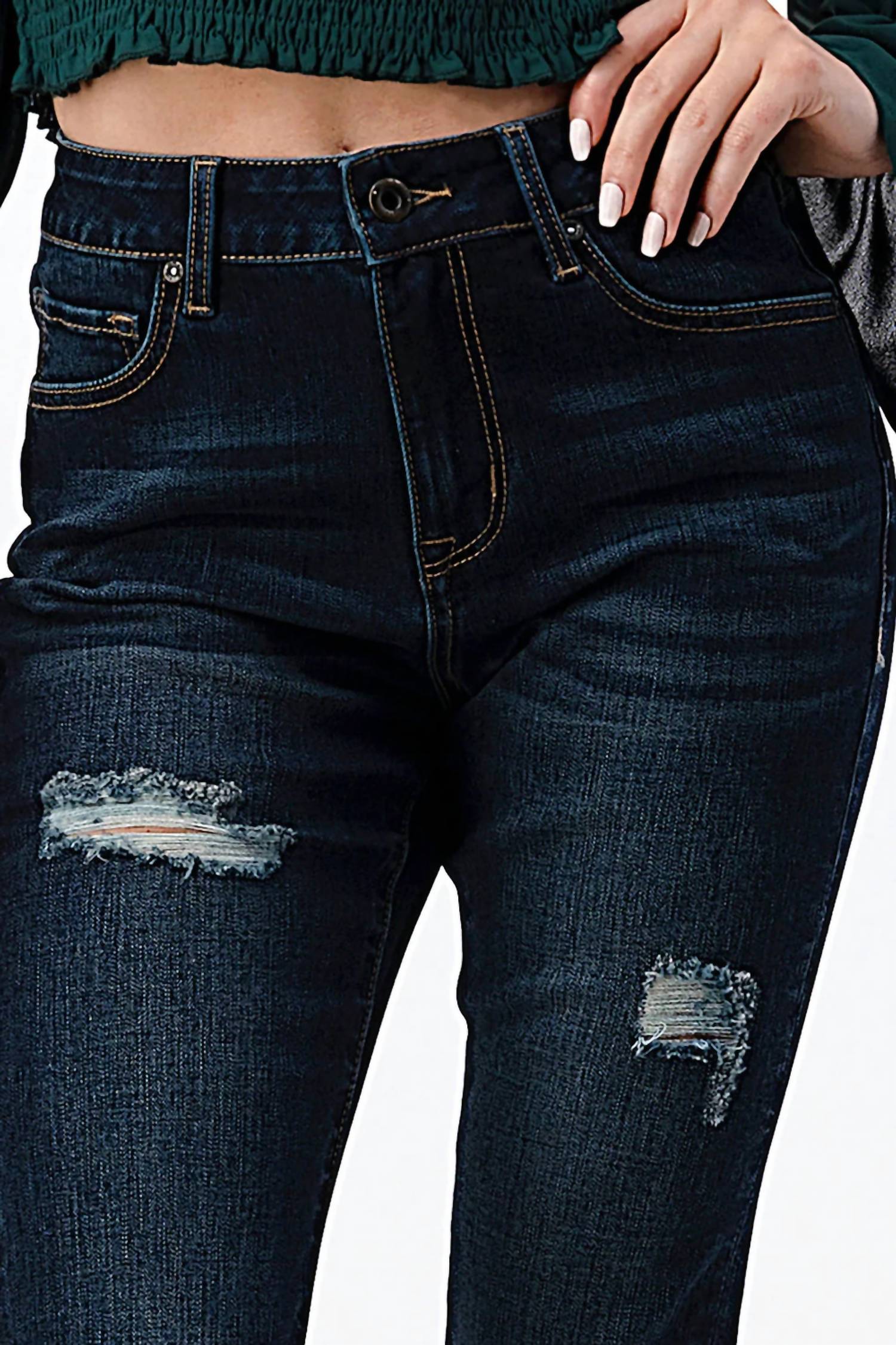 A skinny jean that is both flatering and comfortable. We love this style because it works great with boots, or without! Elevate your denim collection with the GRACE IN LA Distressed Skinny Jean in a chic dark wash, perfect for holiday parties and preppy spring outings. This solid-patterned, high-rise jean features a slim fit and skinny leg to accentuate your curves. Made from a cotton blend of 66% cotton, 21% polyester, 11% rayon, and 2% elastane, it offers stretch with excellent holding power, detailed with natural hand-sanding and whiskering for a vintage flair. Closure: Button closure. Care instructions recommend hand wash cold and line dry; avoid bleaching or ironing.