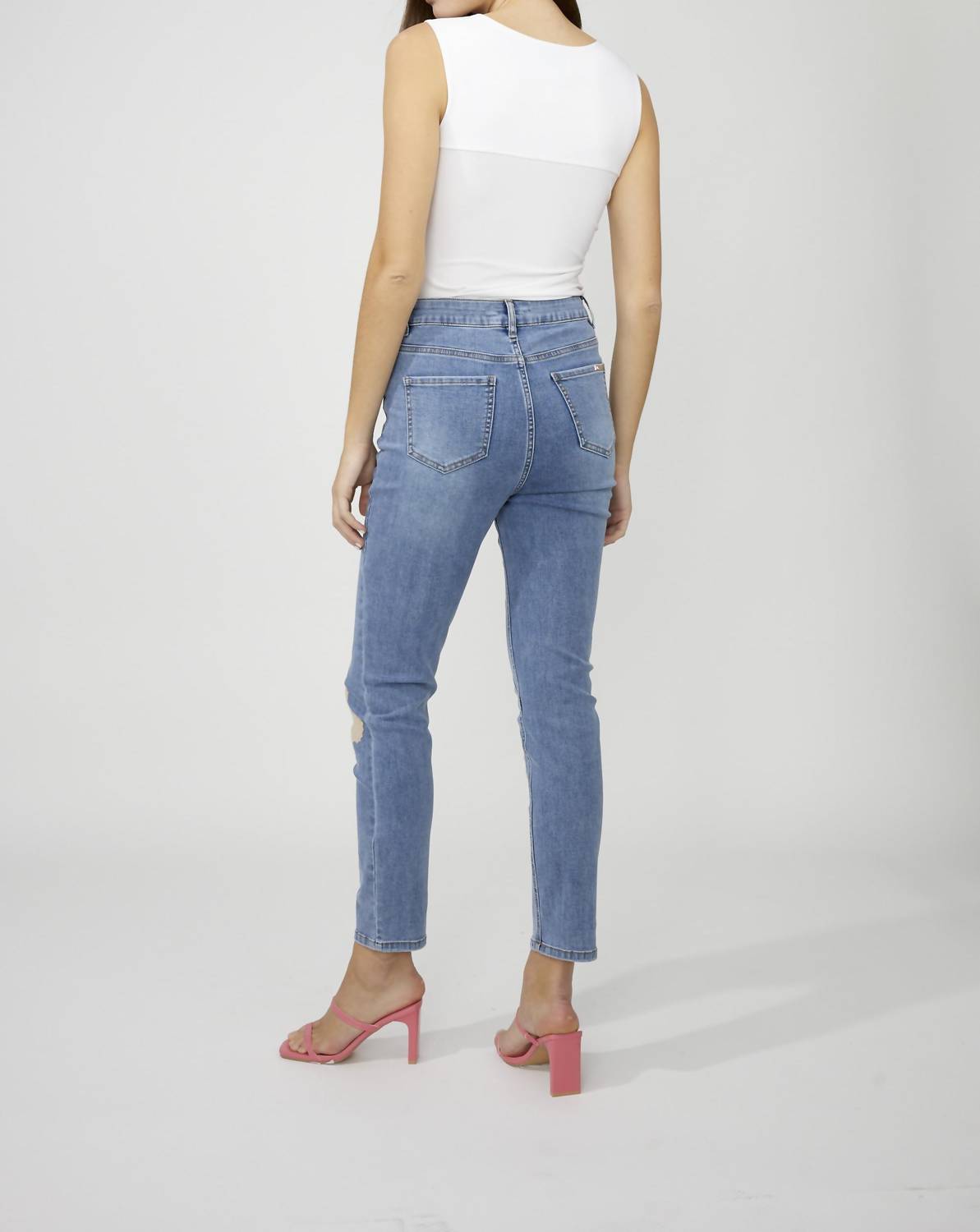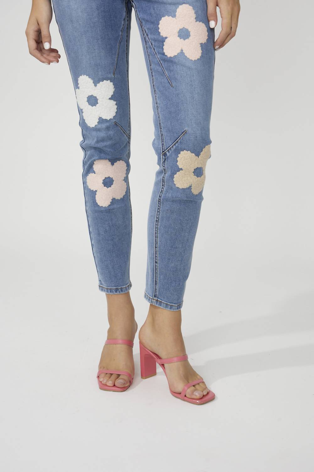 Everyone needs a good pair of skinny jeans and this is a style you'll keep reaching for no matter the season. Add a touch of feminine elegance to your summer wardrobe with the Floral Embroidered Skinny Jeans by Frank Lyman. Crafted in a light wash denim, these full-length, mid-rise jeans feature intricate floral embroidery and chic buttons, making them perfect for casual outings. Composition: 73% Cotton, 23% Polyester, 3% Rayon, 1% Elastane. With both side and back pockets, it combines style and practicality in a slim-fit design. Closure: Zip closure. Care: Hand wash. Approximate inseam length (size 12): 28" (71 cm).
