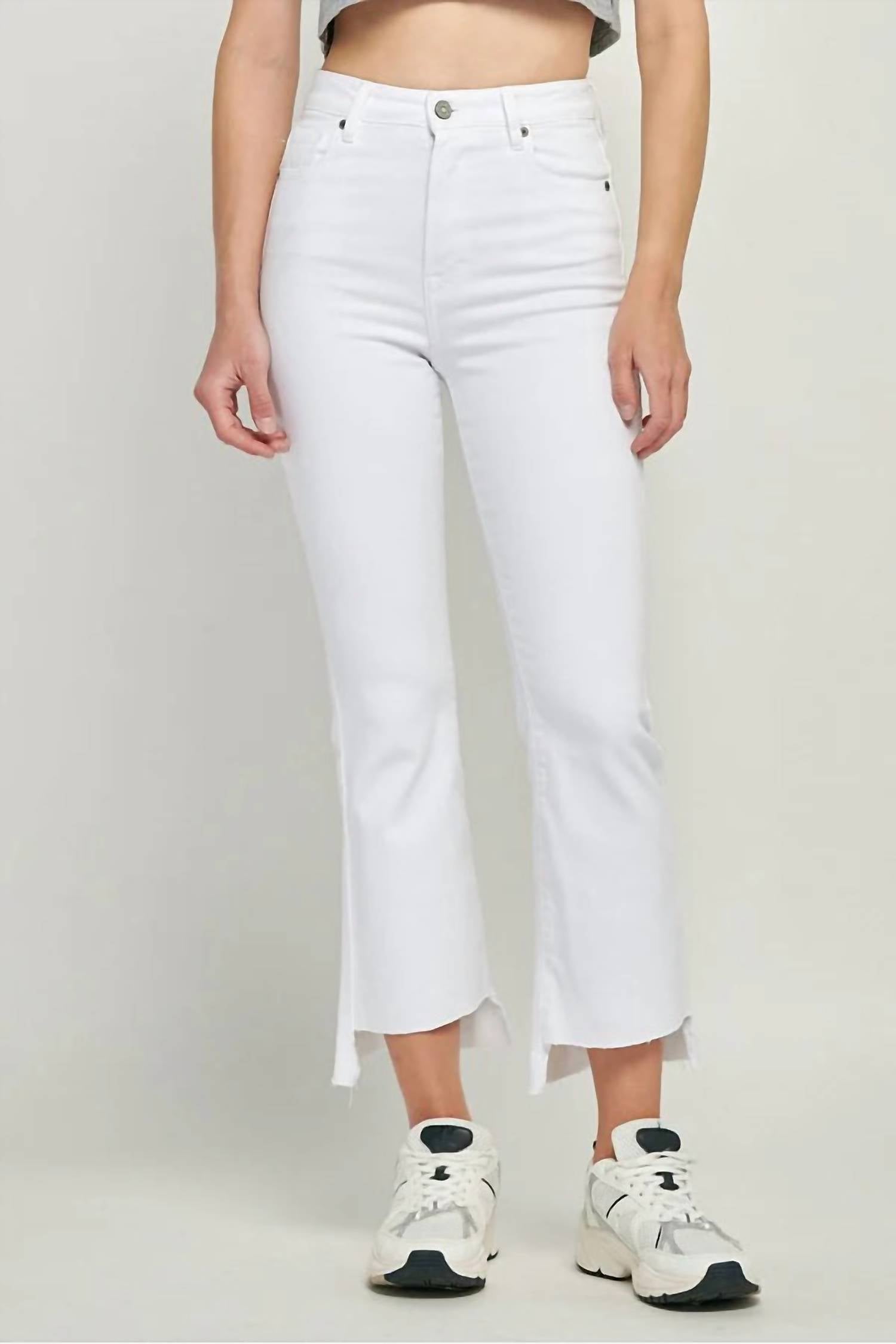 A skinny jean that is both flatering and comfortable. We love this style because it works great with boots, or without! Introducing the Women's Happi Crop Flare Step Hem Jeans by HIDDEN, designed to elevate your summer wardrobe. These jeans offer a sleek and classic fit with a solid white, light wash denim construction and a high-rise waistline. The cropped flare leg style and added pockets contribute to its streetwear appeal, perfect for vacation outings. Crafted for comfort with stretch fabric, these jeans feature a secure zip closure.