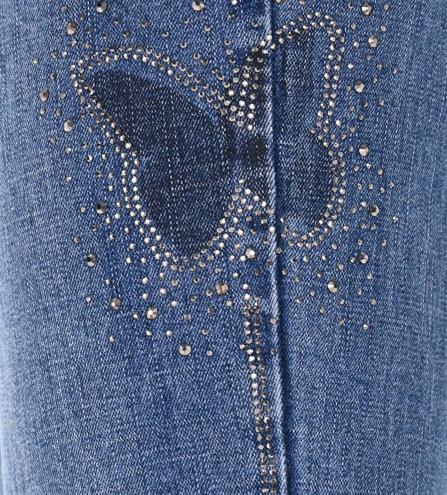 A skinny jean that is both flatering and comfortable. We love this style because it works great with boots, or without! These Frank Lyman denim blue jean pants feature a sleek butterfly silhouette adorning the side, accentuated with sparkling rhinestone embellishments, add a touch of whimsical charm to any ensemble. This unique fusion of classic denim and delicate butterfly motifs exudes both sophistication and playful elegance.