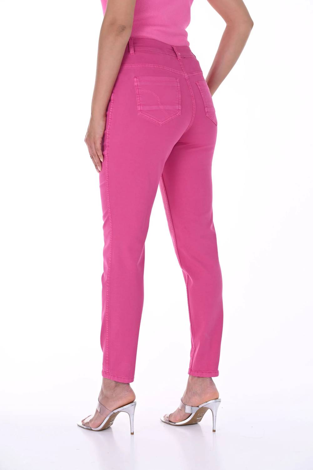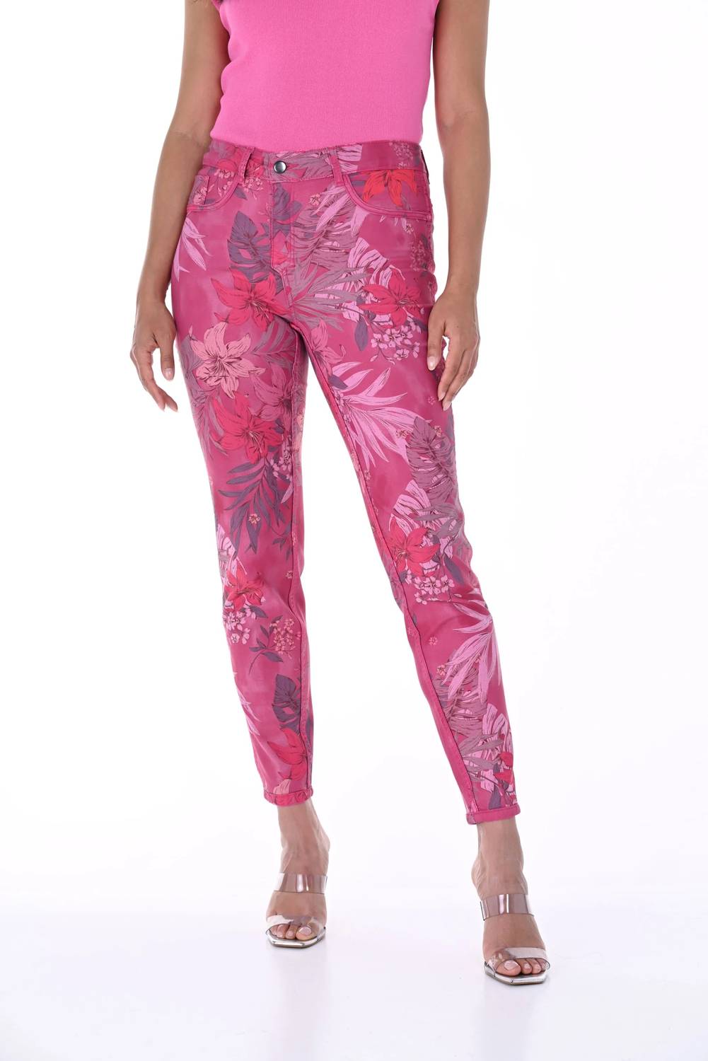 Everyone needs a good pair of skinny jeans and this is a style you'll keep reaching for no matter the season. Discover the Frank Lyman Woven Reversible Jean, a stylish choice for any occasion. These pants offer versatile flair with a vibrant floral print on one side and a sleek solid fuchsia on the reverse. Expertly crafted from 70% cotton, 27% polyester, and 3% spandex denim, they feature a mid-rise waist and a skinny leg silhouette. Closure is a convenient zip closure, and care is simple with hand wash in cold water and hang to dry; do not iron.