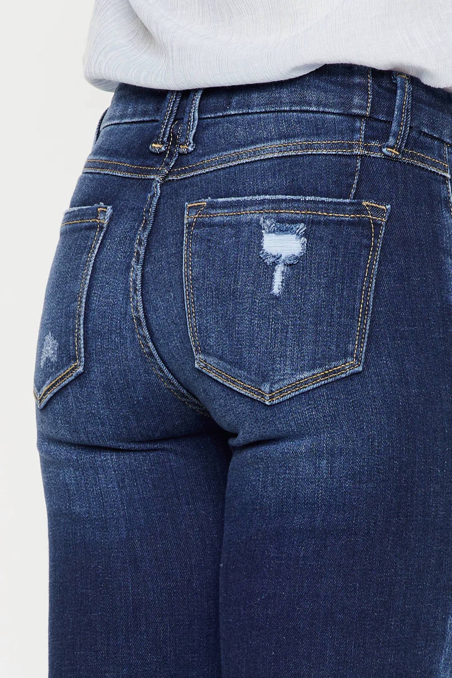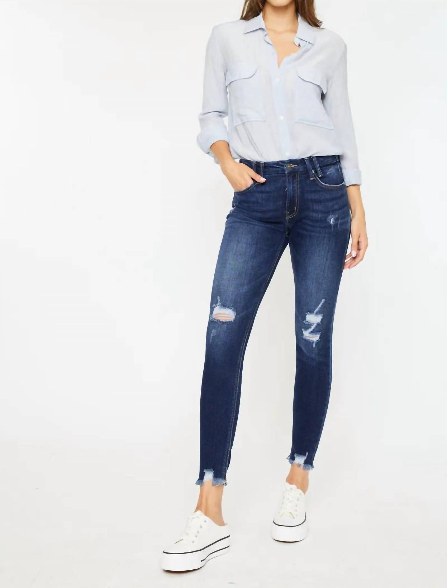 Introducing the KanCan Mid Rise Skinny Ankle Jean in a fashionable medium wash, perfect for elevating any casual outfit. These jeans feature a mid-rise waist with a 9.25" rise, a 27.5" inseam, and have a flattering skinny leg style. They are crafted from a high-quality blend of 93% cotton, 6% polyester, and 1% spandex and are designed with light distressed details and raw frayed hems. The classic 5-pocket styling and single button front closure with a convenient zip fly make them both functional and chic. Care for these jeans with ease by machine washing and tumble drying.