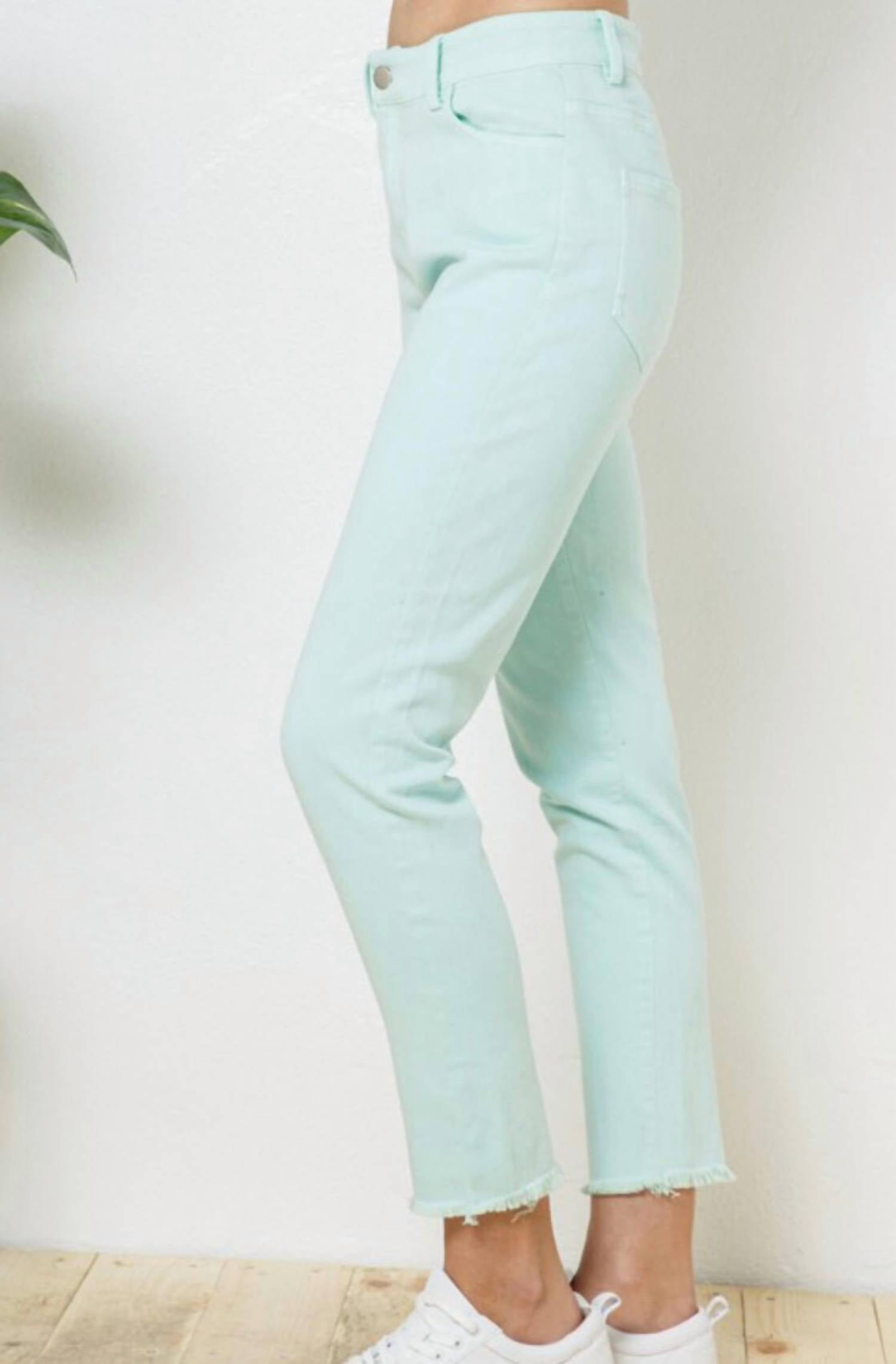 Everyone needs a good pair of skinny jeans and this is a style you'll keep reaching for no matter the season. These mint-colored jeans are expertly crafted from a cotton blend, combining 95% cotton and 5% spandex for a perfectly stretchy and soft feel. Featuring a regular waistline and an above-the-ankle crop style with minor fringe hem detail, these jeans offer both comfort and style. Zip closure.