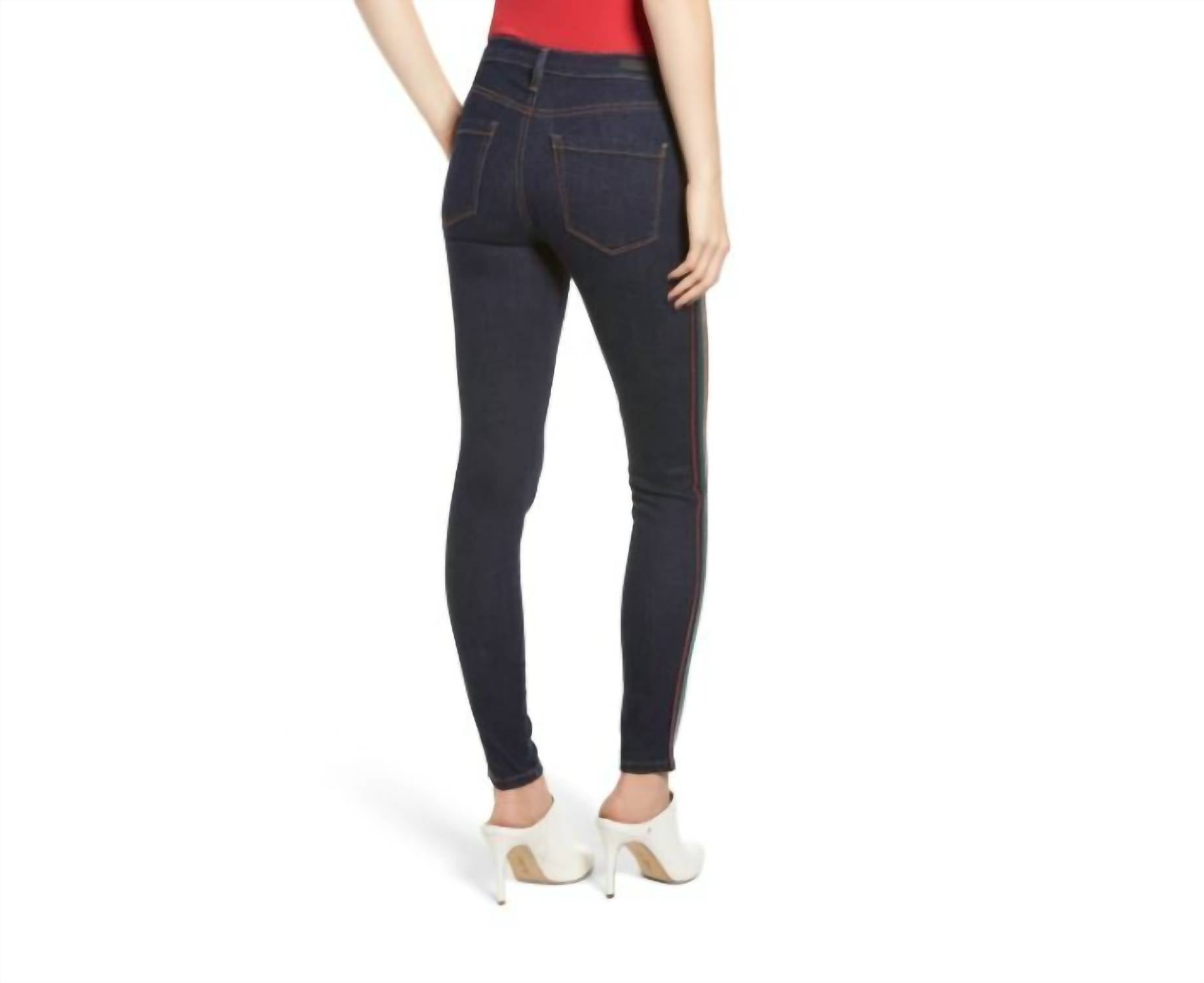 Introducing The Bond Metallic Glitter Side Stripe Skinny Jeans by BLANKNYC, where svelte sophistication meets vibrant style. These skinny denim jeans feature sparkling rainbow stripes and a comfortable high-rise fit. Composition: 93% cotton, 6% polyester, 1% elastane, with a 28.5" inseam. Closure: Zip fly with button. Care instructions: Machine wash and tumble dry. With a true-to-size fit, these jeans boast a five-pocket style and 9.5" leg opening at the hip, making them practical and chic for any occasion.