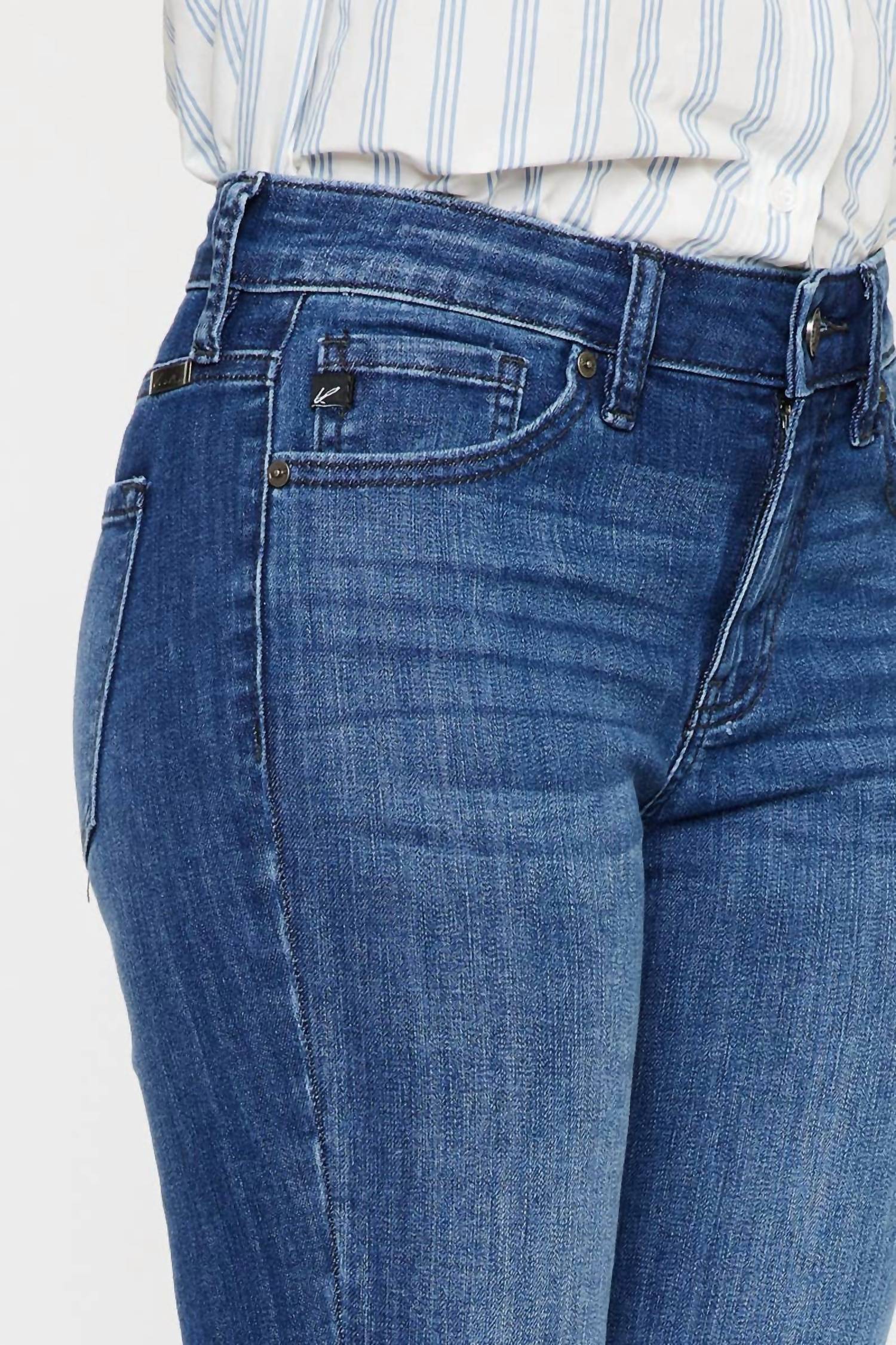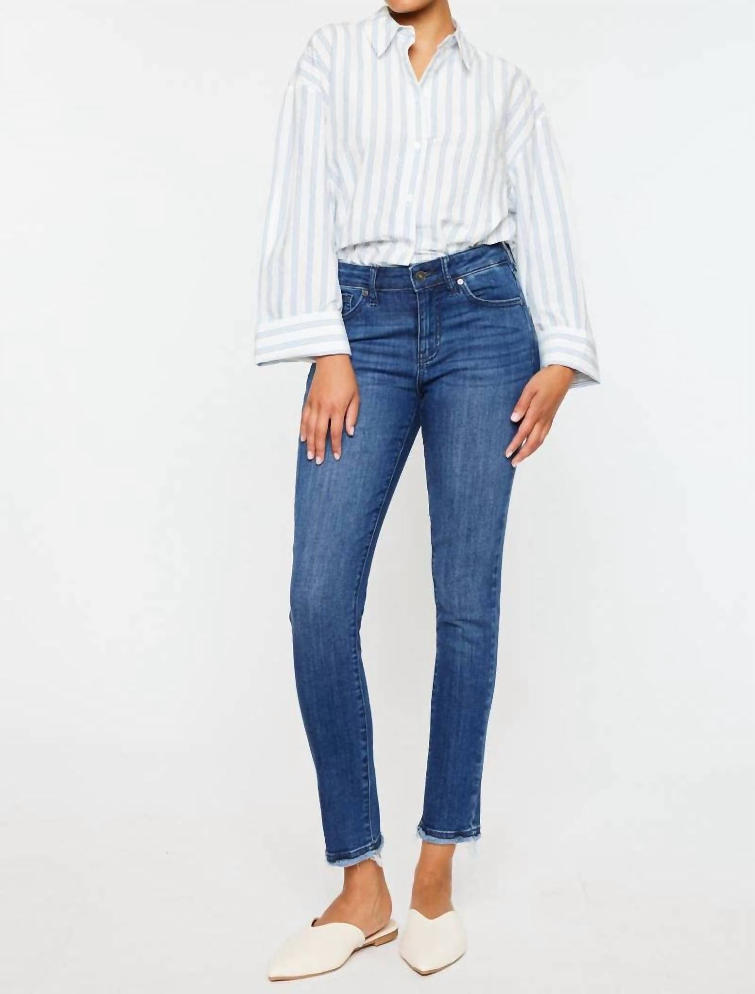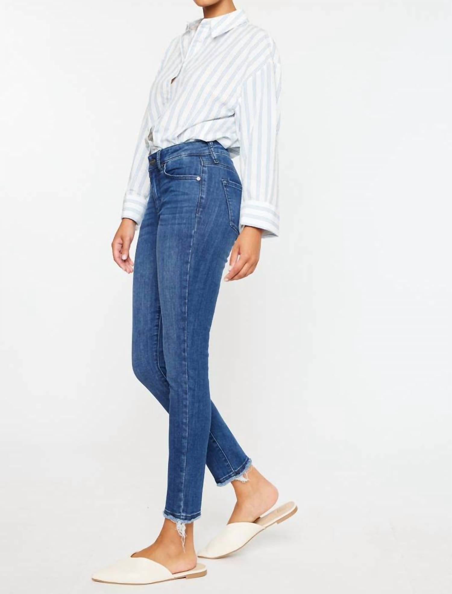 A skinny jean that is both flatering and comfortable. We love this style because it works great with boots, or without! Step into style with the KanCan Midrise Skinny Jeans, an eco-friendly choice in a medium wash perfect for the concert or streetwear scene. Crafted from a sustainable cotton blend, these jeans offer a slim fit with a comfortable mid-rise waist and a 9.25” zipper fly. Featuring a skinny leg silhouette, the 27.5" inseam adds an elegant touch. With a 5-pocket style and button closure, they are both practical and trendy.