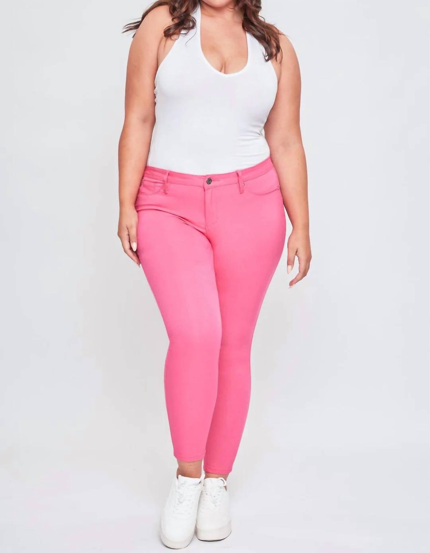 A skinny jean that is both flatering and comfortable. We love this style because it works great with boots, or without! Elevate your style with the YMI Hyperstretch Skinny Jeans in Fiery Coral, a must-have for those seeking comfort and trendsetting design. These jeans, crafted from a soft cotton blend composition of 70% Cotton, 26% Nylon, and 4% Spandex, feature a mid-rise waist with a single-button and zip closure for a sleek look. The skinny leg style, complete with faux front pockets and two back pockets, is designed for a slim fit and includes an inseam of 30 inches and a leg opening of 12.5 inches. Care instructions are straightforward: machine wash cold and tumble dry low.
