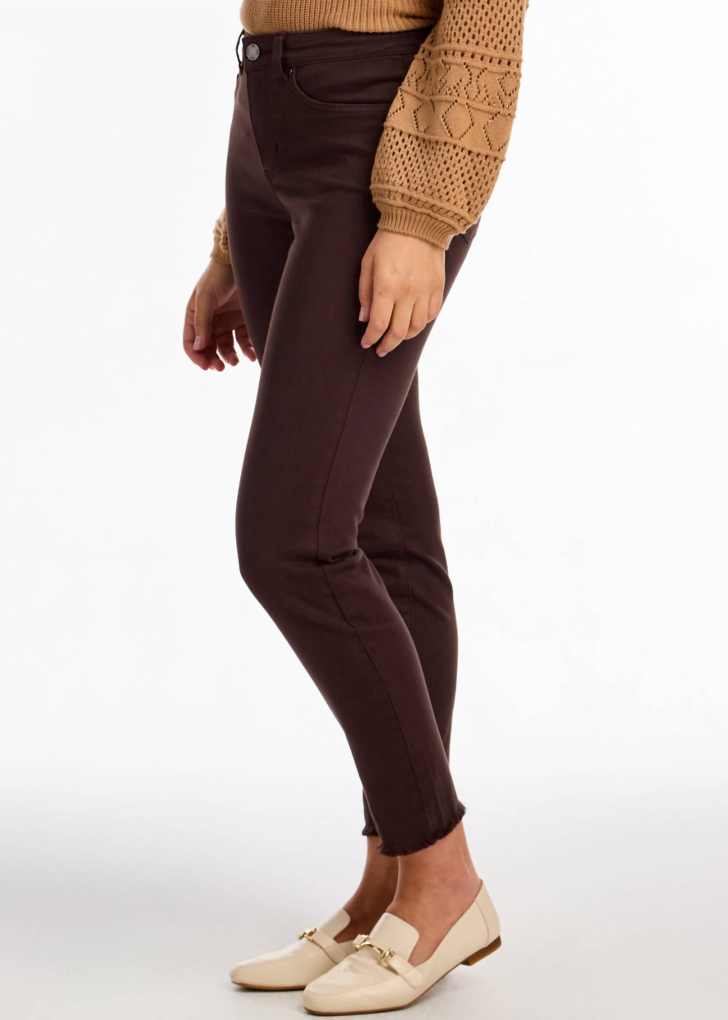 A skinny jean that is both flatering and comfortable. We love this style because it works great with boots, or without! Discover the Olivia Slim Ankle Jeans by FDJ, the perfect addition to your fall wardrobe. These brown, slim-fit jeans feature a trendy skinny leg and a mid-rise waist, offering both style and comfort for any adventure. Crafted from an 89% Cotton, 10% Polyester, 1% Elastane blend, they feature a solid pattern with a button closure and practical pockets. With a 28" inseam, these jeans are machine washable and should be line dried for best care, making them ideal for vacation and everyday wear.