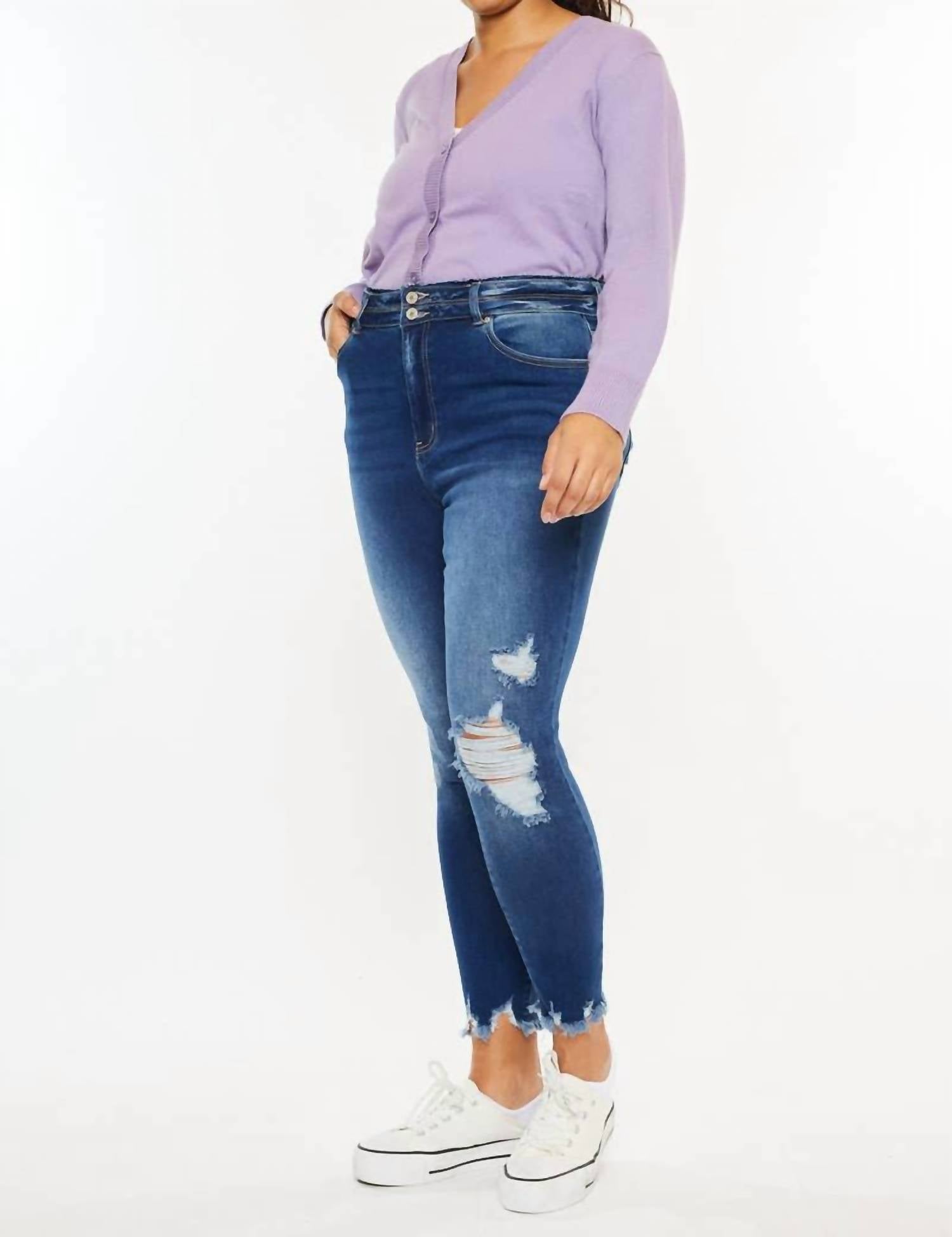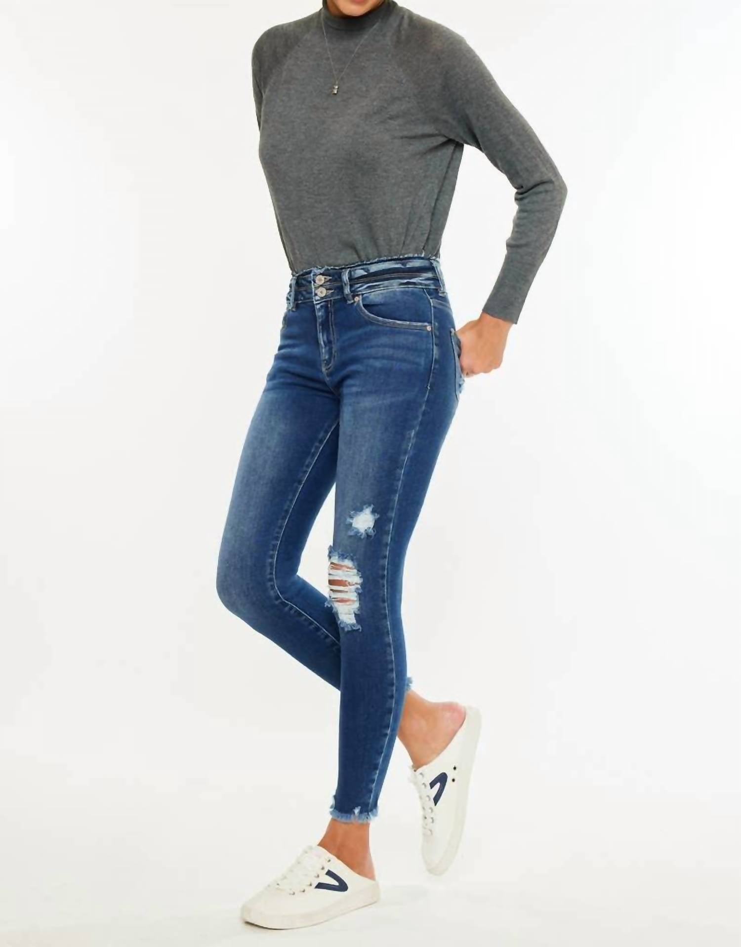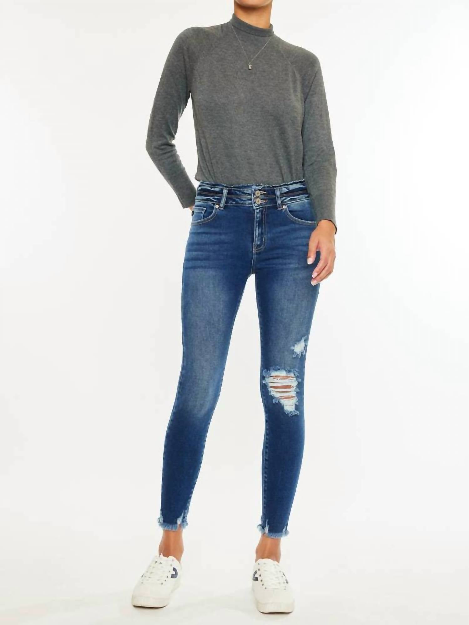 The perfect skinny jeans to wear with your favorite boots this season! Introducing the High Rise Double Button Skinnies by KanCan, your perfect pair for any holiday party. Crafted from a comfortable cotton blend with a composition of 95% cotton, 4% polyester, and 1% lycra, these jeans offer a slim fit in a stylish blue medium wash. The high-rise design features a double button and zip closure, complemented by a no stitch raw hem and a distressed look for an edgy touch. With a rise of 10" and an inseam of 27" for size 3/25, these jeans provide a flattering and dynamic fit for spring.
