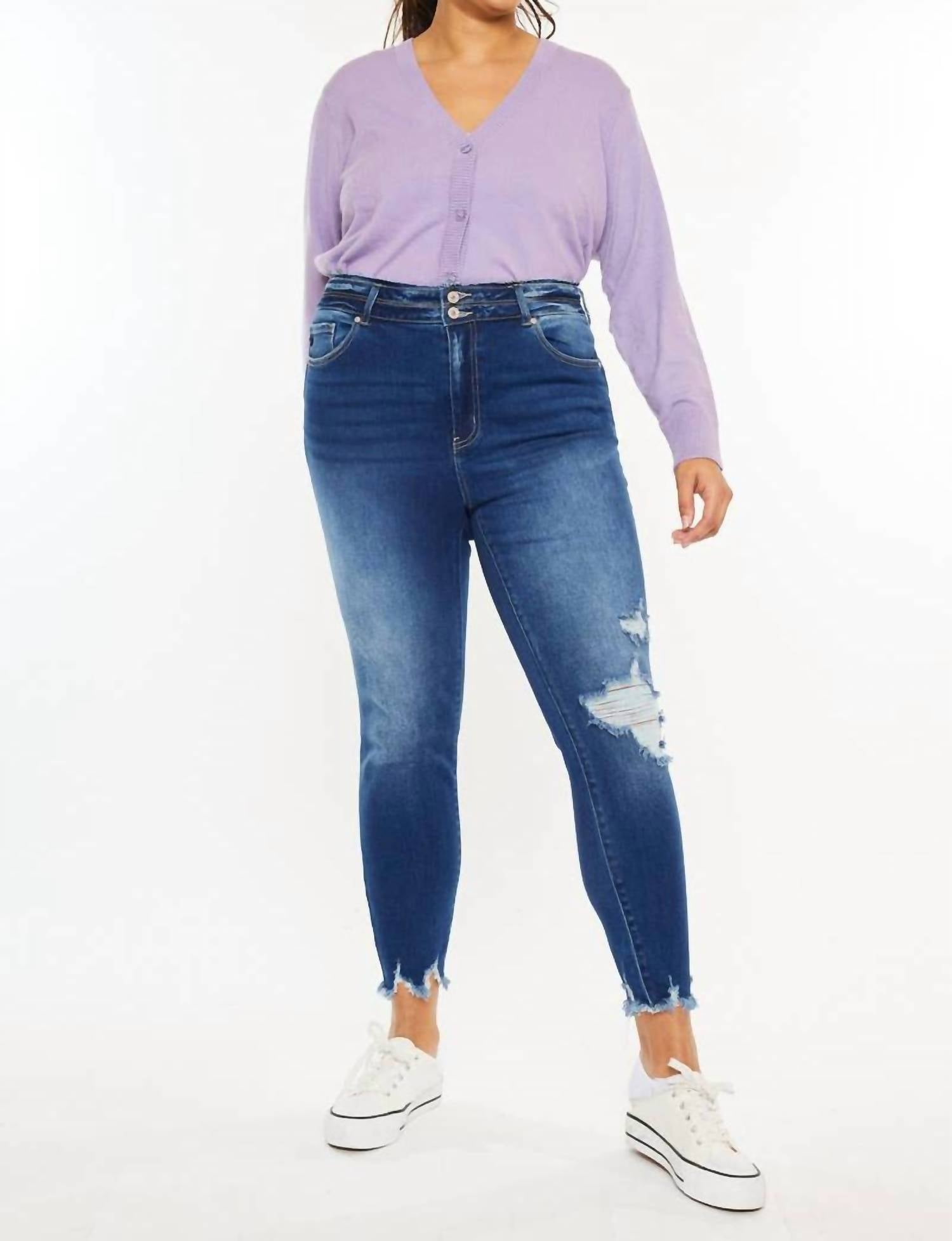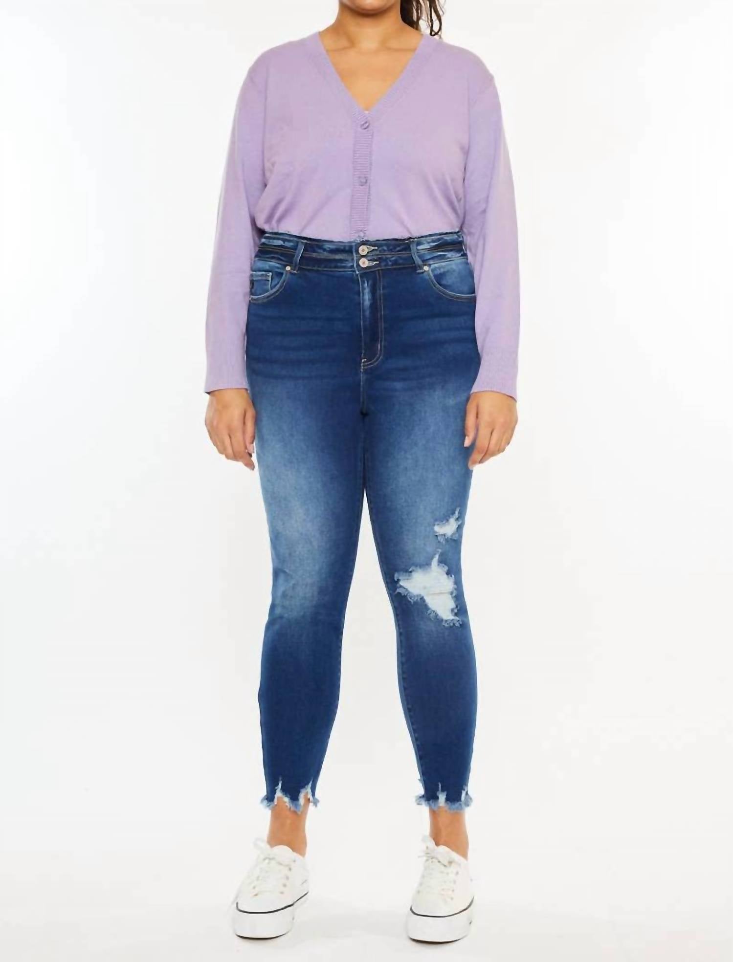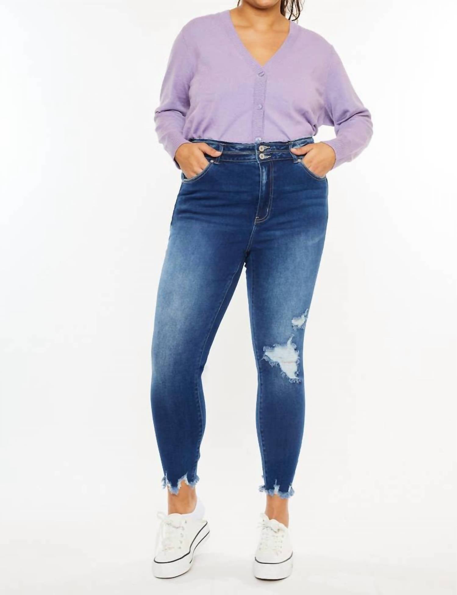 The perfect skinny jeans to wear with your favorite boots this season! Introducing the High Rise Double Button Skinnies by KanCan, your perfect pair for any holiday party. Crafted from a comfortable cotton blend with a composition of 95% cotton, 4% polyester, and 1% lycra, these jeans offer a slim fit in a stylish blue medium wash. The high-rise design features a double button and zip closure, complemented by a no stitch raw hem and a distressed look for an edgy touch. With a rise of 10" and an inseam of 27" for size 3/25, these jeans provide a flattering and dynamic fit for spring.