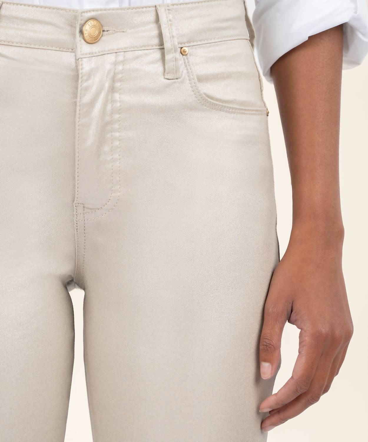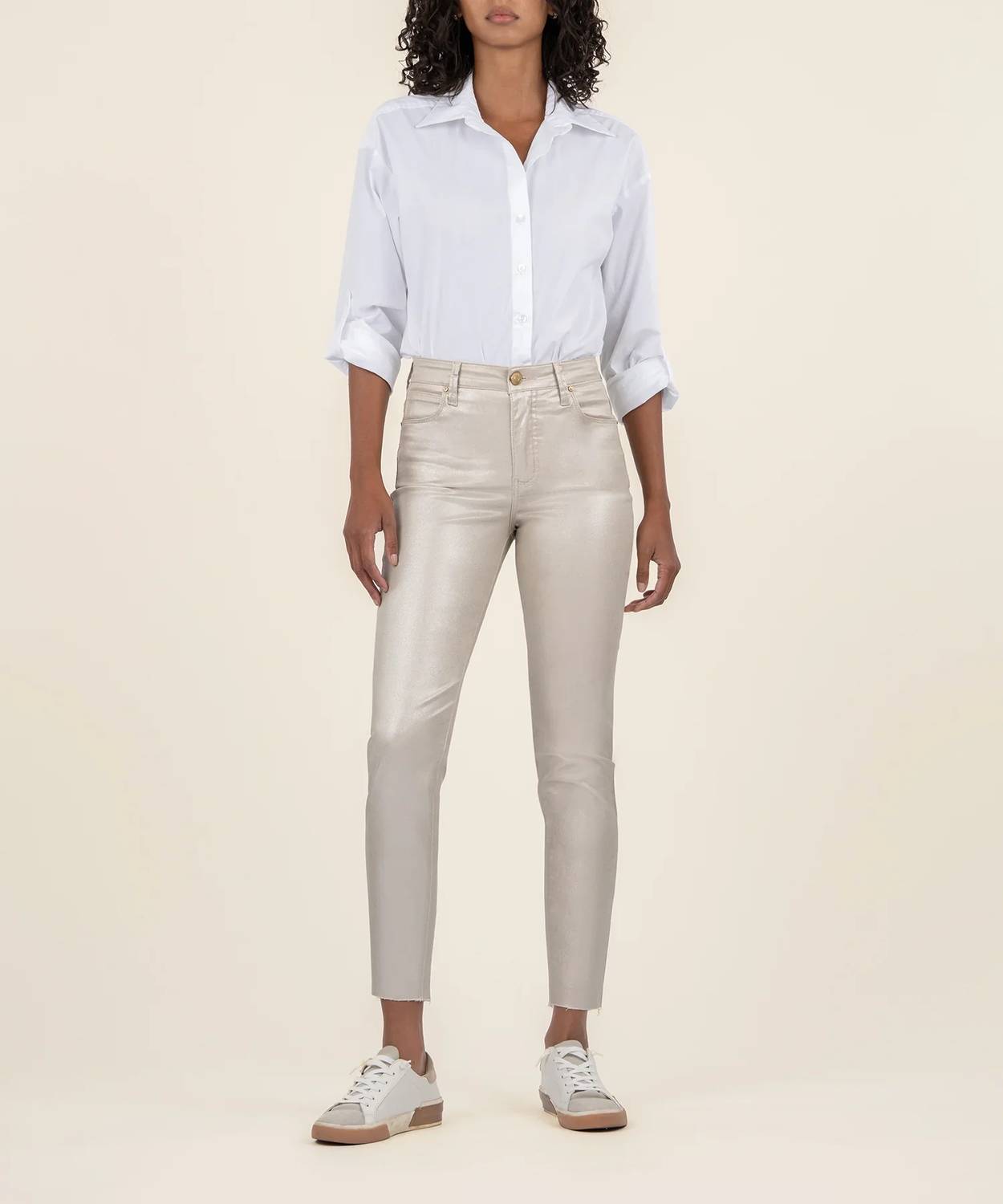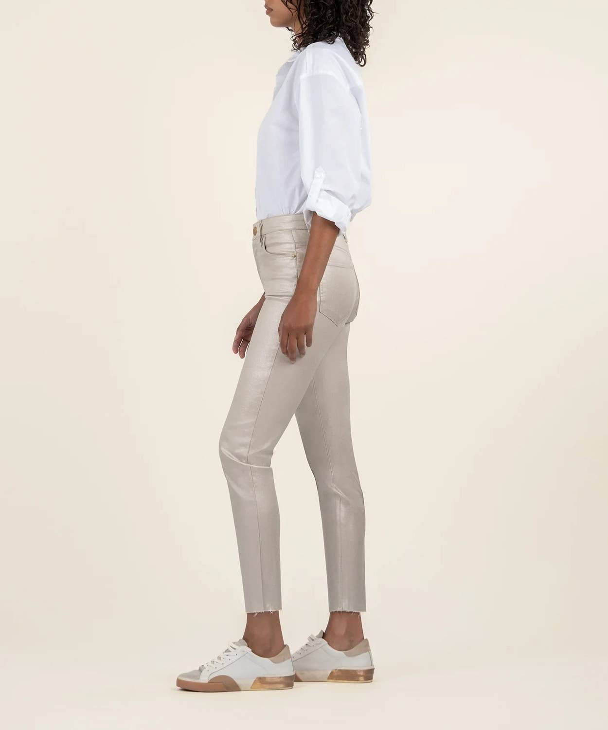 Shine at your next evening event with the Charlize Jean by KUT FROM THE KLOTH in a stunning rose gold hue. Crafted from a 97% Cotton and 3% Spandex blend, these high-rise jeans flatter with their fab ab front pockets and sleek skinny leg design. The sophisticated silhouette features a 10.5" rise and 27" inseam, ensuring a comfortable and chic fit. Equipped with a zip closure, these jeans are machine washable and can be tumble dried, making them as practical as they are stylish.