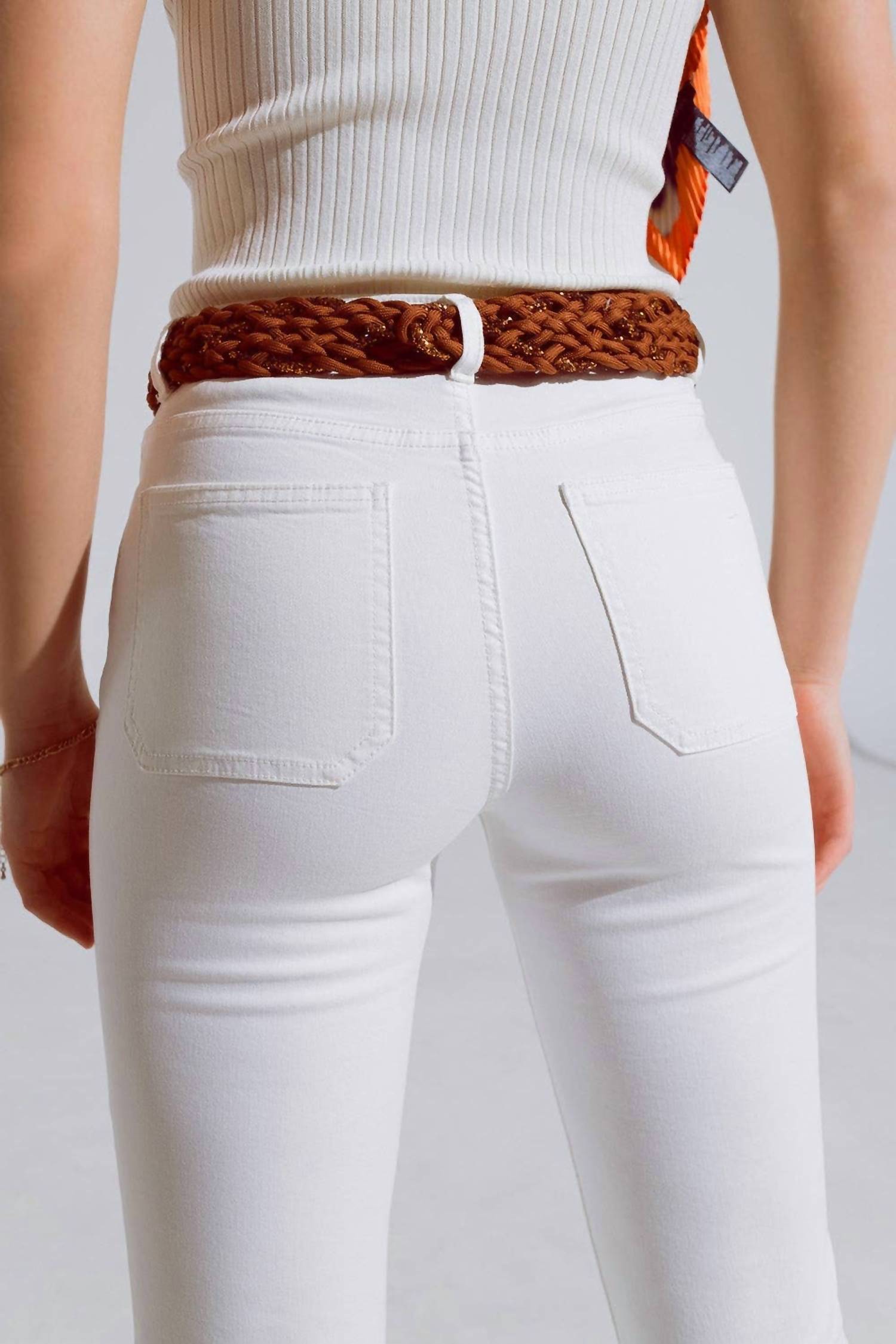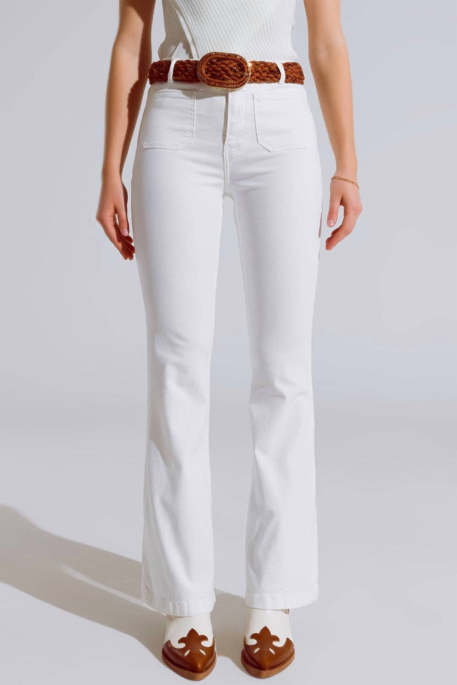 A skinny jean that is both flatering and comfortable. We love this style because it works great with boots, or without! Elevate your wardrobe with the Skinny Flared Jeans from Q2, a sleek addition in versatile white perfect for any occasion. These full-length jeans feature a skinny fit with a stylish flared leg, crafted from stretch denim for comfort and mobility. Closure: Zip closure with pouch pocket detail. Care: Machine wash, line dry. Ideal for your spring minimalist wardrobe.
