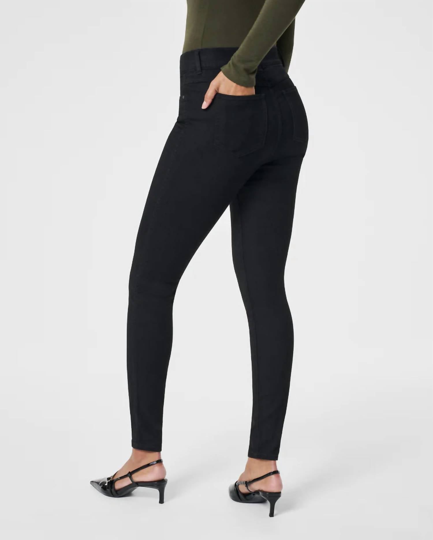 Everyone needs a good pair of skinny jeans and this is a style you'll keep reaching for no matter the season. Introducing the Ankle Skinny Jeans by Spanx in Clean Black, a staple piece designed to enhance your silhouette with hidden tummy shaping. These high-rise jeans feature a pull-on design with a slim fit through the hip and thigh, complemented by a skinny leg and five-pocket detail. Crafted from a cotton blend composed of 91% Cotton, 7% Polyester, and 2% Lycra Elastane, these jeans promise comfort and style. Care: Machine wash inside out on a gentle cycle, tumble dry low.