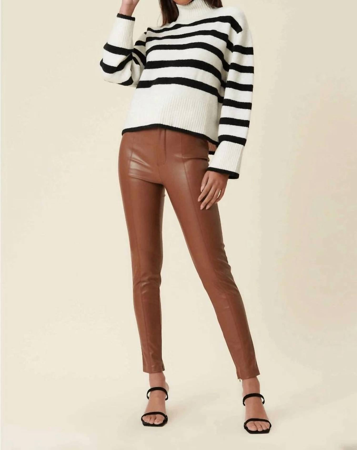 A skinny pant that is both flatering and comfortable. We love this style because it works great with boots, or without! Discover the Sixty One Vibrant Faux Leather Skinny with Zipper Pants in a rich cognac hue, perfect for your next dinner party. These solid, high-rise pants feature a clean skinny fit with skinny legs and two back pockets for style. The design includes a zip-fly closure and invisible zippers on the side of the leg openings for a sleek silhouette. With measurements of a rise of 11.5" and an inseam of 29" (size 5), these pants should be dry cleaned for care. Model is 5’10” and wearing a size 3.