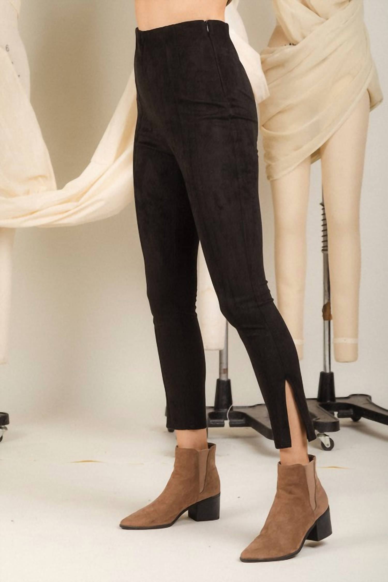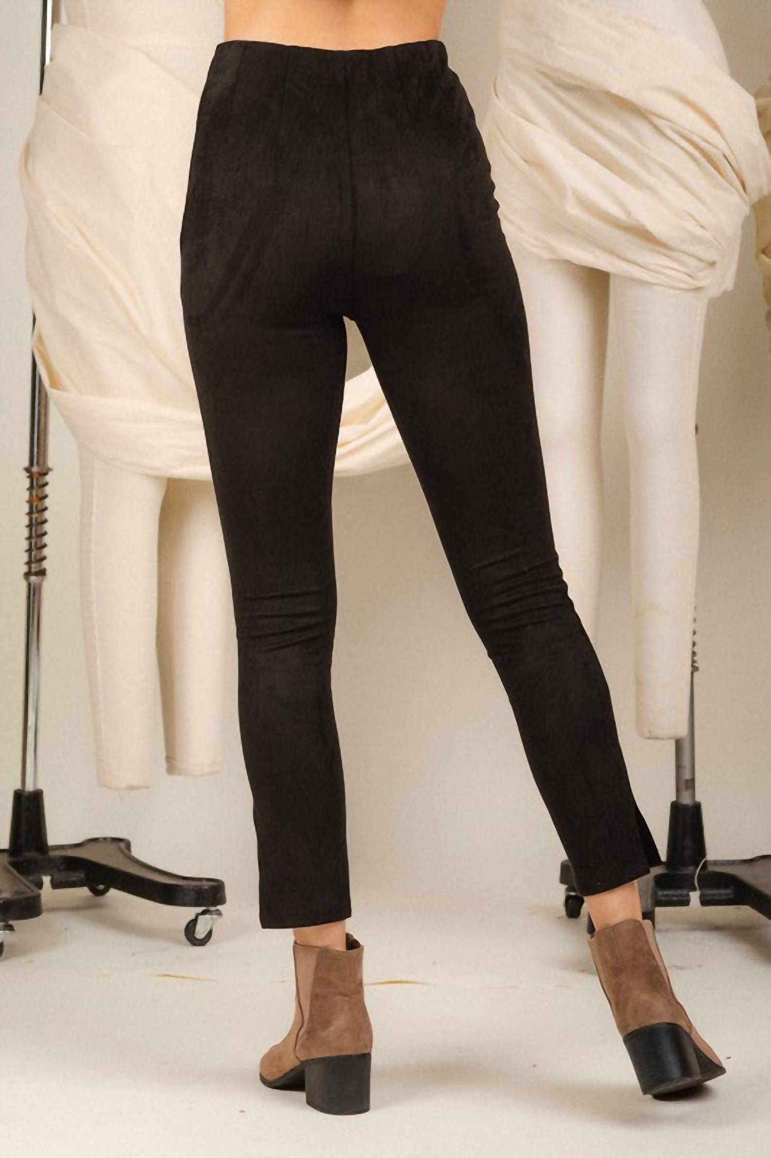 Everyone needs a good pair of skinny pants and this is a style you'll keep reaching for no matter the season. These black suede pants feature a high-rise waistline, fitted silhouette, and side zipper with an elastic waistband. They have a skinny leg and a cropped length with a side slit. Made of 92% polyester and 8% spandex, they are available in small (fits 2-4), medium (fits 6-8), and large (fits 10-12).