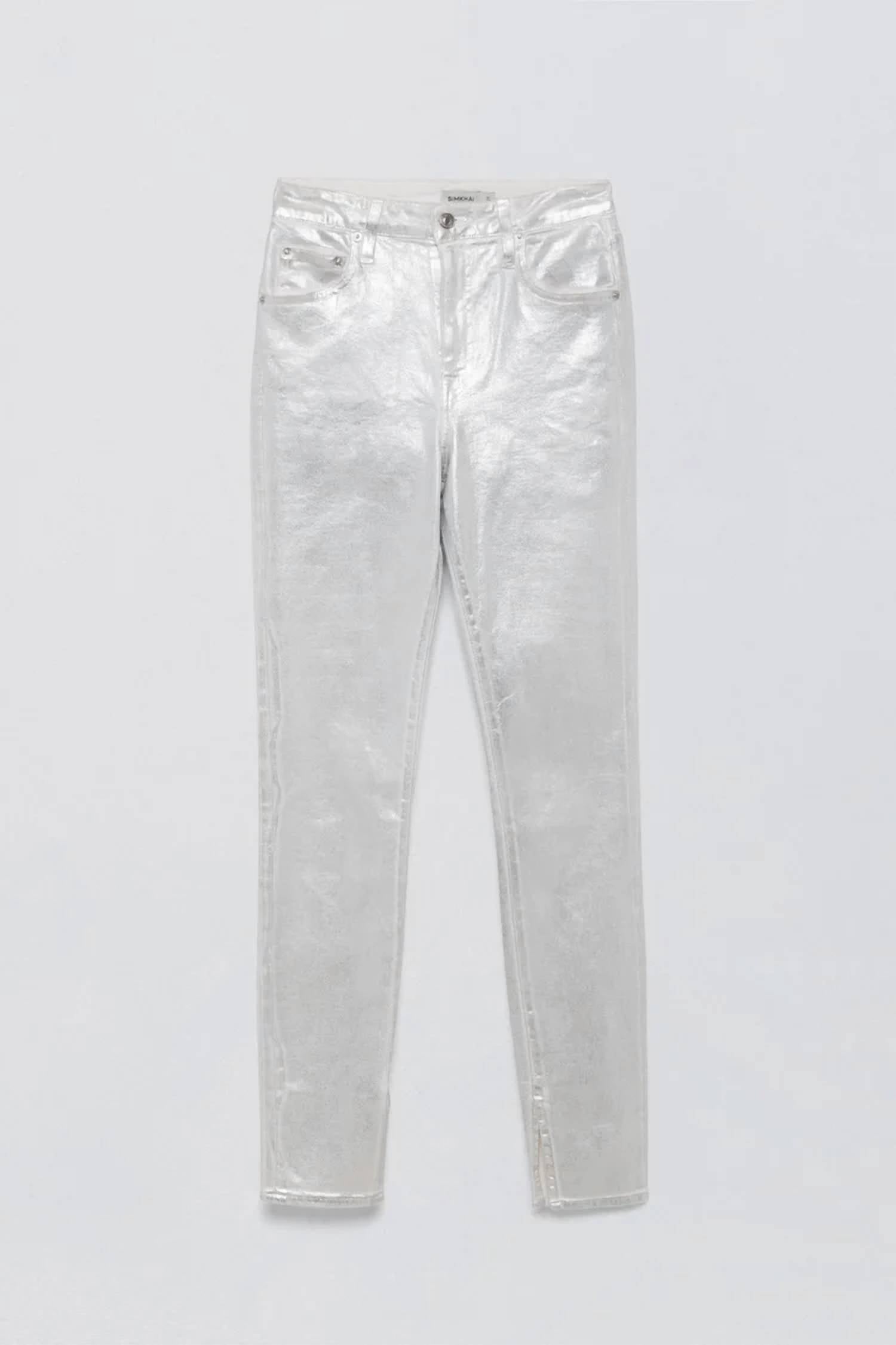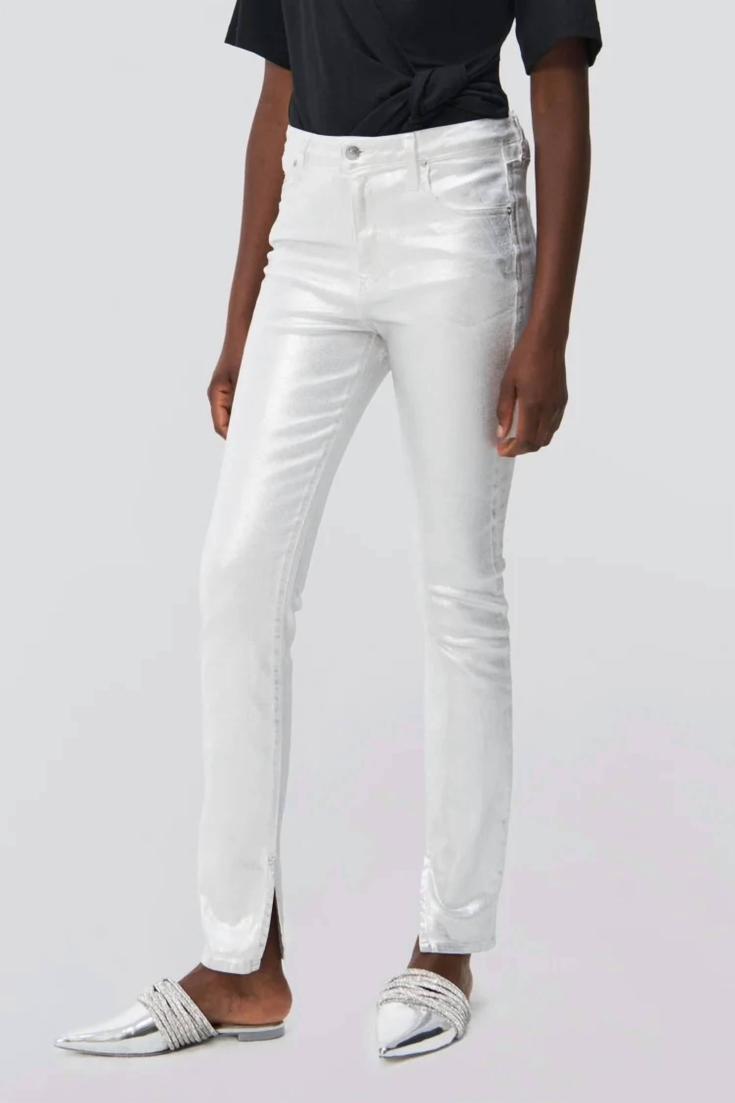 Everyone needs a good pair of skinny pants and this is a style you'll keep reaching for no matter the season. The Rae High Rise Ankle Skinny by Jonathan Simkhai features a chic silver foil finish that adds a standout edge to your wardrobe. These metallic coated denim pants offer a comfortably stretchy fit and are crafted from a cotton blend composed of 97% Cotton and 3% Spandex. With a high-rise skinny leg design, it includes a discreet slit at the ankle to elegantly showcase your footwear. Made in the USA, they offer a zipper fly and button closure, with a 31.5" inseam, and should be dry cleaned only.