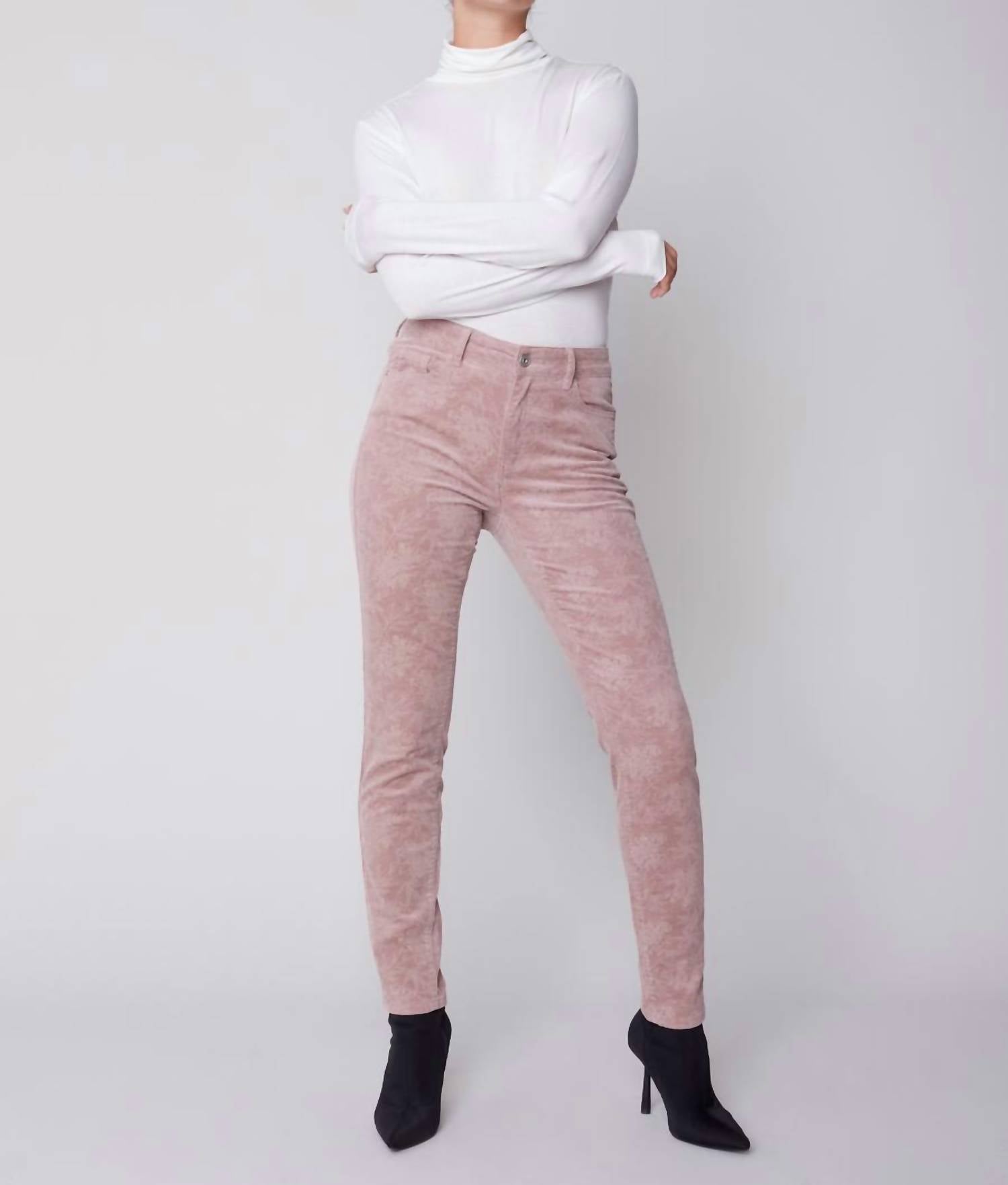 The perfect skinny pant for those stylish boots this season! Introducing the new Charlie B Powder Printed Corduroy Stretch Pant. These stylish pants will add a stunning pop of color to any outfit. Showcasing a beautiful powder print, the fabric is both soft and stretchy for all-day comfort. Get ready to make a statement in style. 98% Cotton, 2% Spandex. 30 inch length. 5 pockets. Mid-rise waist. Hand wash cycle.