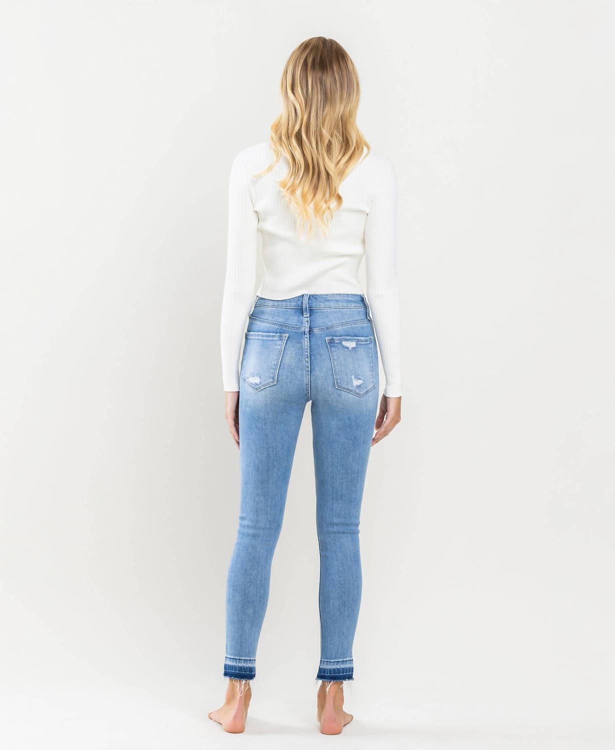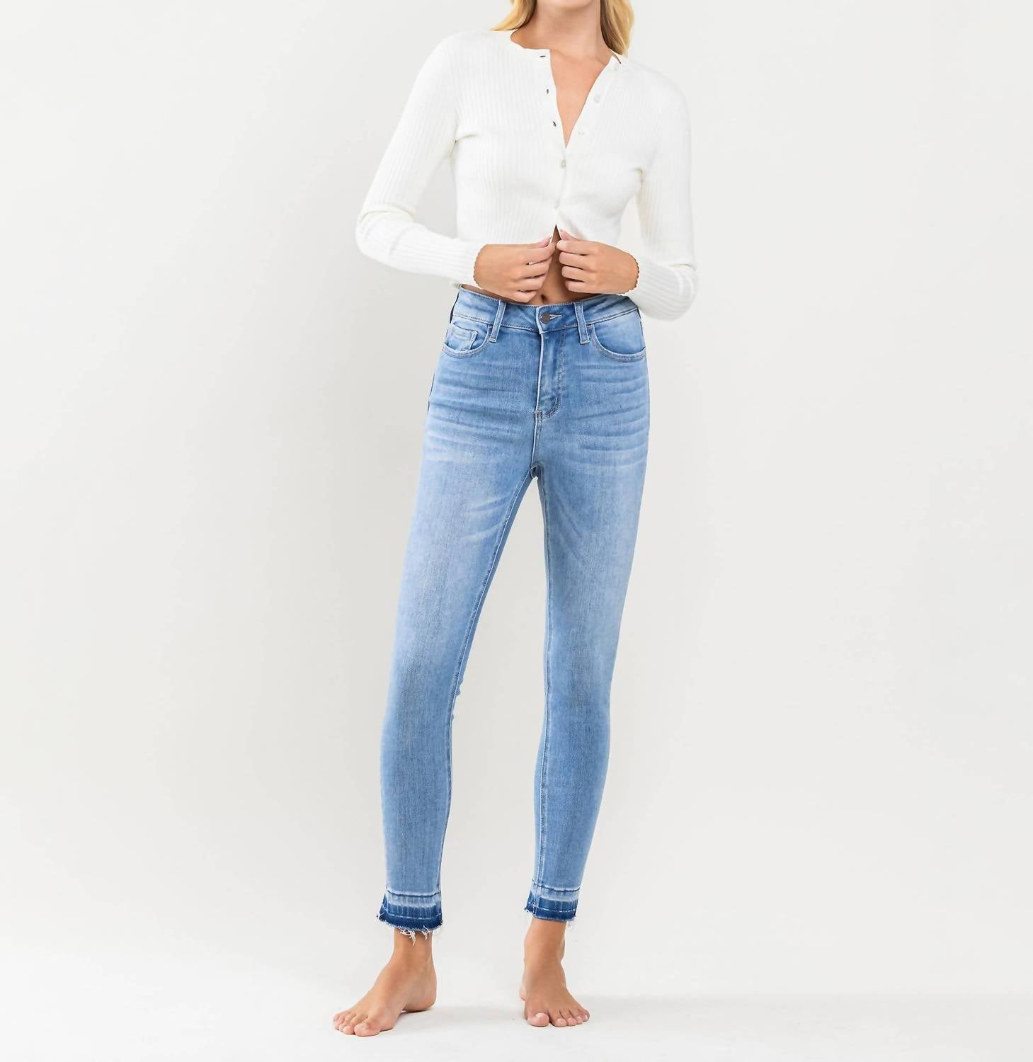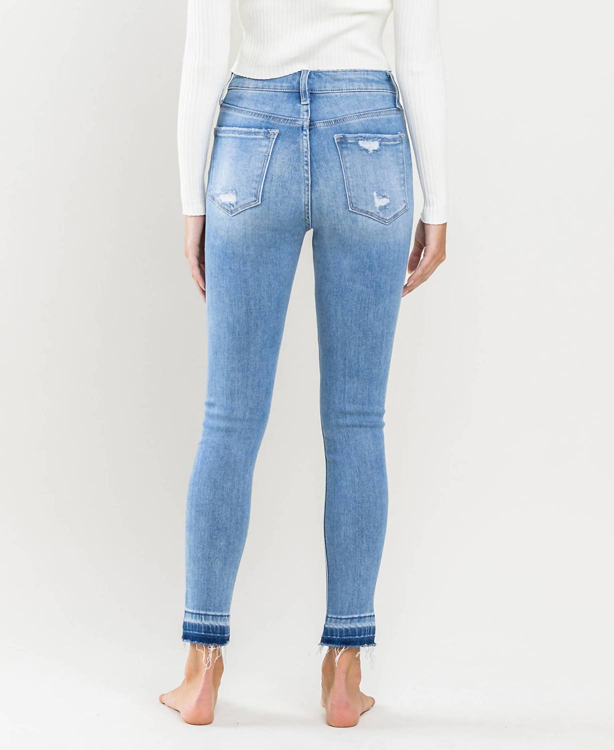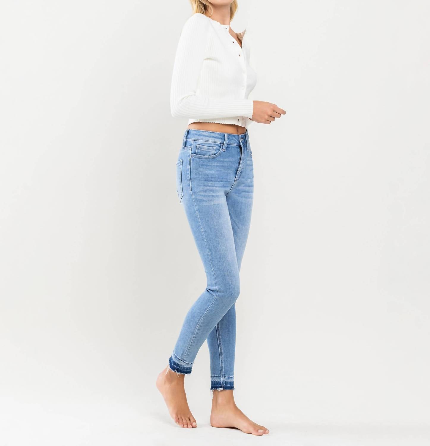 Everyone needs a good pair of skinny pants and this is a style you'll keep reaching for no matter the season. Introducing the Vervet High Rise Crop Skinny Jeans in the striking color "Mental Phrase" from Vervet by Flying Monkey. These jeans feature a high-rise waist and a slim fit through the skinny leg, finished with a distinctive contrast and distressed hem. Crafted from comfort stretch denim, they measure a front rise of 10 inches, inseam of 27 inches, and leg opening of 10 inches, complete with a convenient zip closure. Easy to care for, you can machine wash and tumble dry these jeans, making them a practical addition to your spring wardrobe. The model is 5'9'' and wears a size 26.