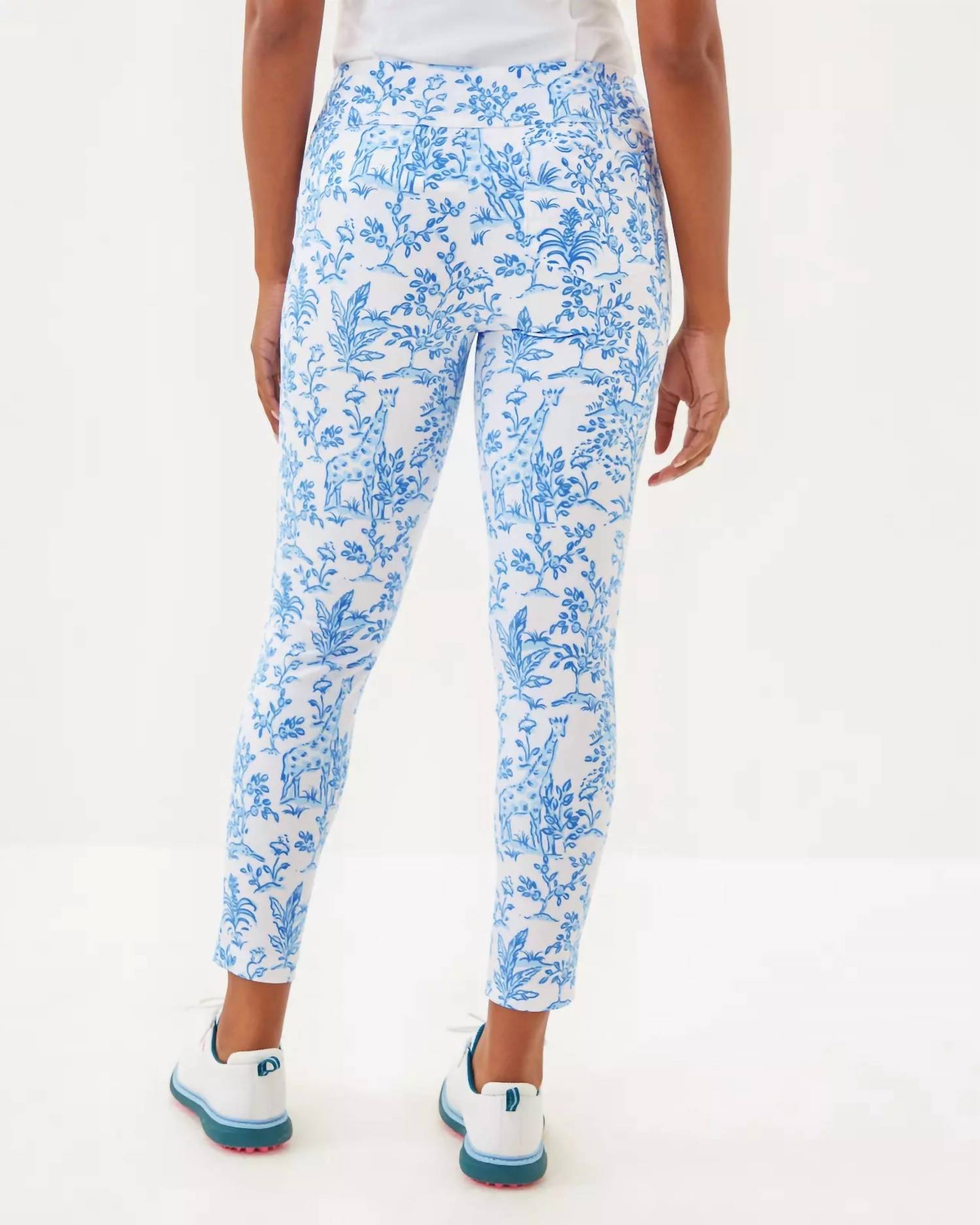 Everyone needs a good pair of skinny pants and this is a style you'll keep reaching for no matter the season. Elevate your golf style with the Luxletic Corso Pant from Lilly Pulitzer, designed in a pristine Resort White Tall Tales Golf pattern. With a skinny leg and slim fit, these high-rise pants are crafted from Fairway Performance Twill®—comprising 91% Polyester and 9% Spandex—boasting moisture-wicking and UPF 50+ technology. They feature a convenient pull-on design with an inseam of 28 inches, ideal for both comfort and protection on sunny days out on the greens. These chic pants are imported and should be machine washed on a cold, delicate cycle.