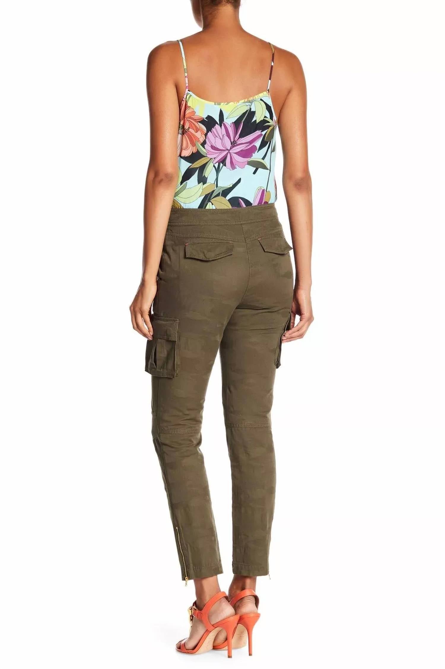 Elevate your wardrobe with the Isley Pant by Trina Turk, designed in an Olive Camo print for a chic finish. Crafted from 100% cotton, these skinny leg pants feature a high rise of 10 inches and a 27.5-inch inseam. They include practical cargo pockets and a zip closure for ease and style. Care is made simple with machine wash and tumble dry instructions, making it a perfect blend of fashion and functionality. Garment length is 37.5 inches.