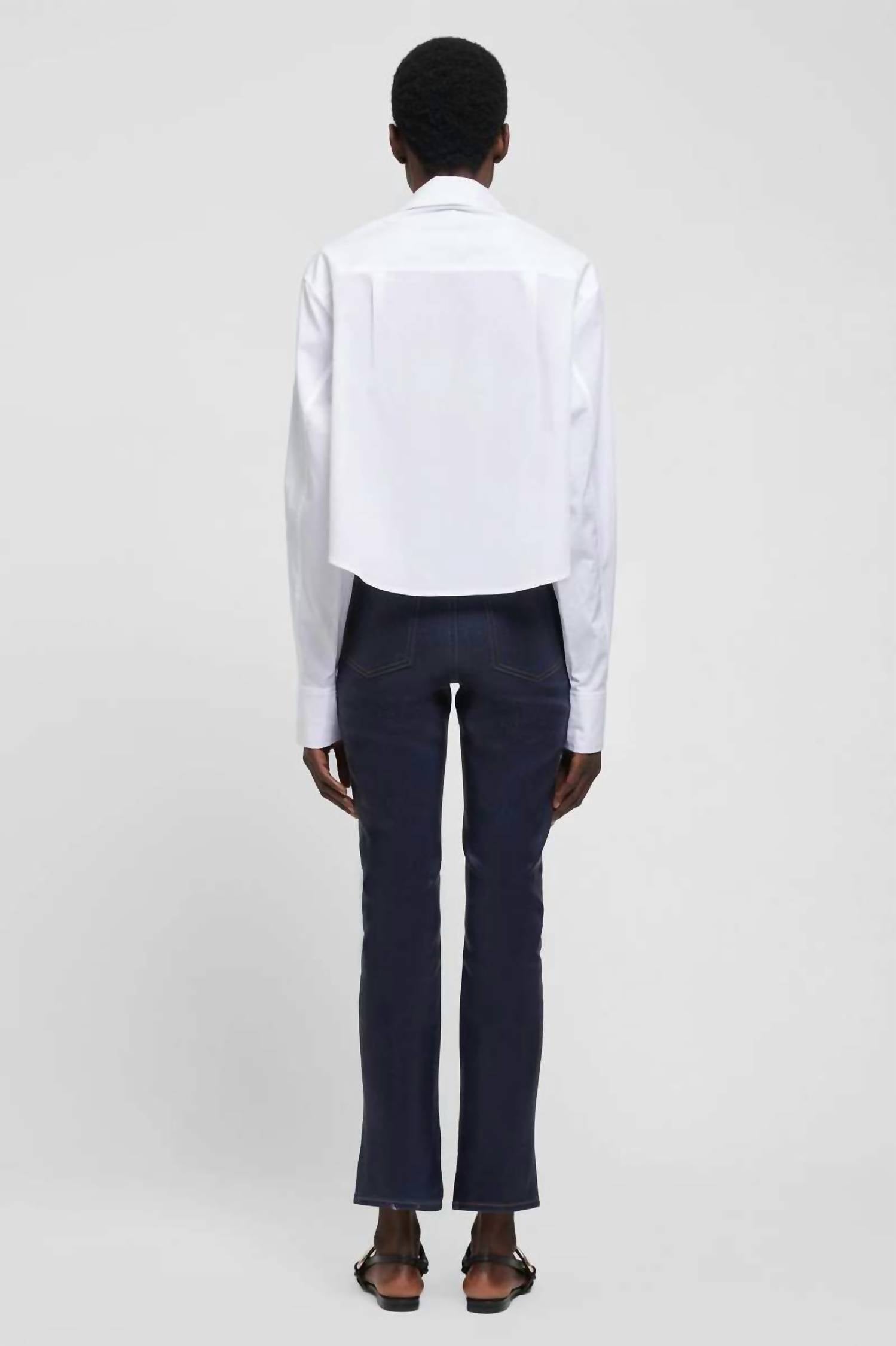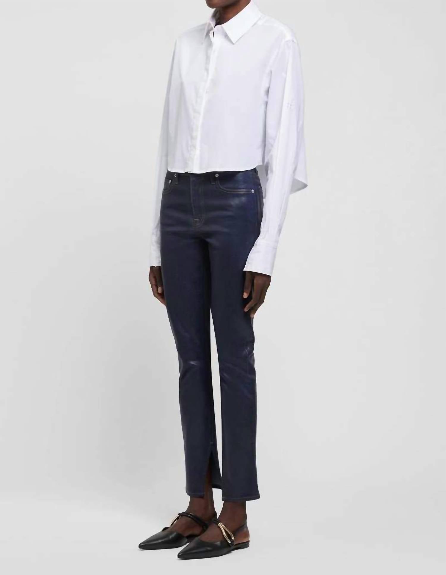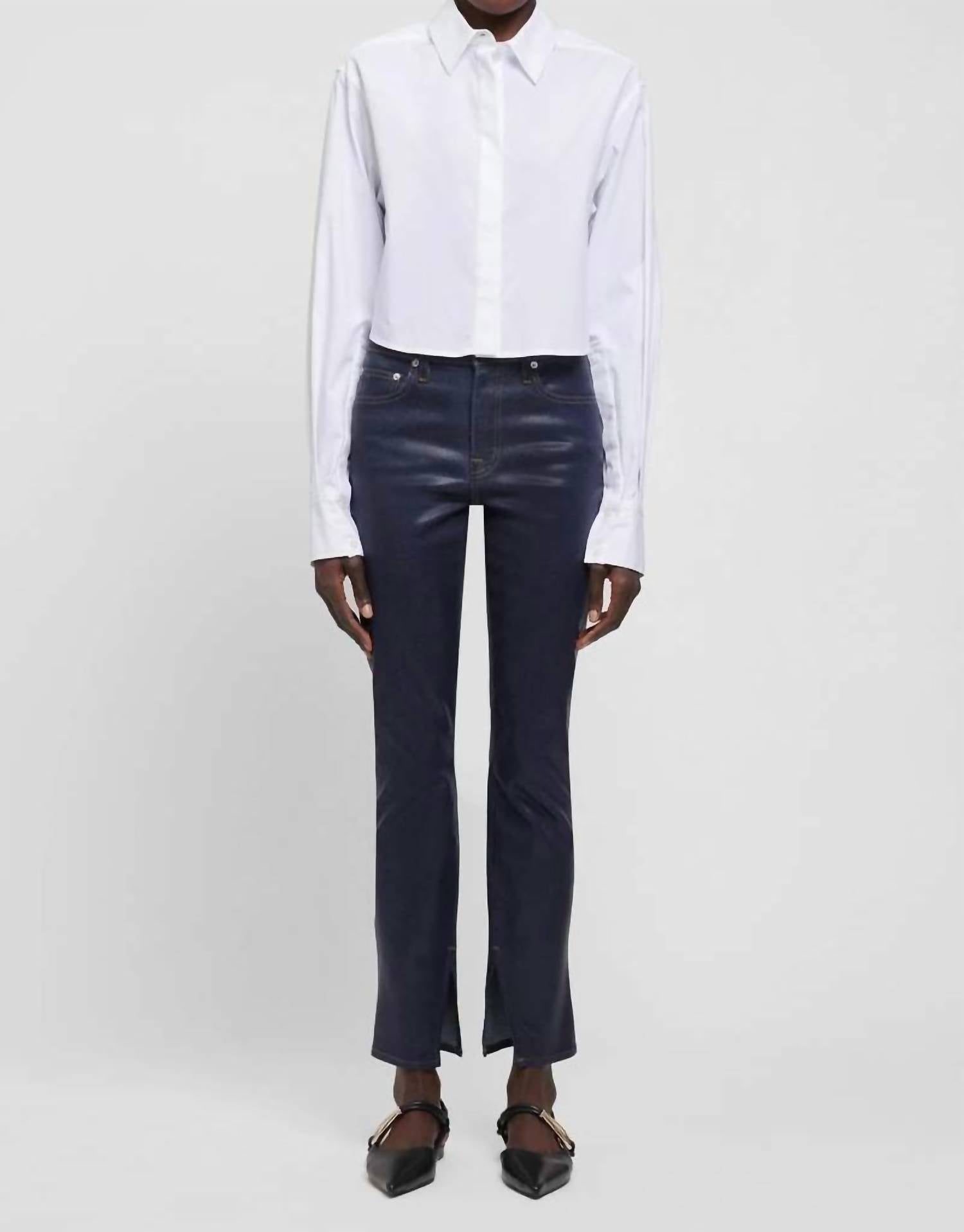 A skinny pant that is both flatering and comfortable. We love this style because it works great with boots, or without! Elevate your evening style with the Rae Ankle Skinny by Jonathan Simkhai, showcasing a mid-rise fit and a skinny leg accentuated by a cropped ankle hem. Crafted from a 97% Cotton and 3% Spandex blend, this coated indigo piece offers a sleek modern sheen. The pants feature a zipper fly and button closure, providing both comfort and style with every wear. For best care, dry clean only.