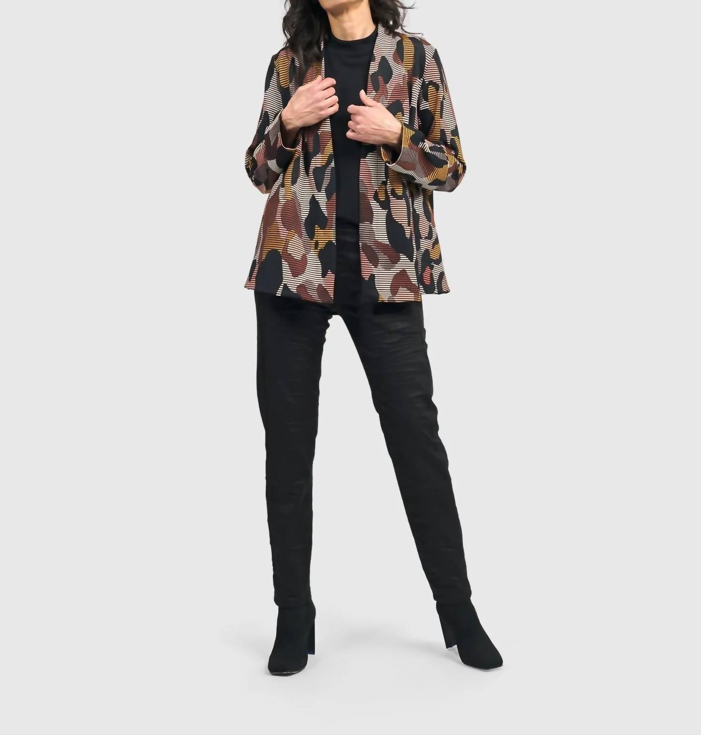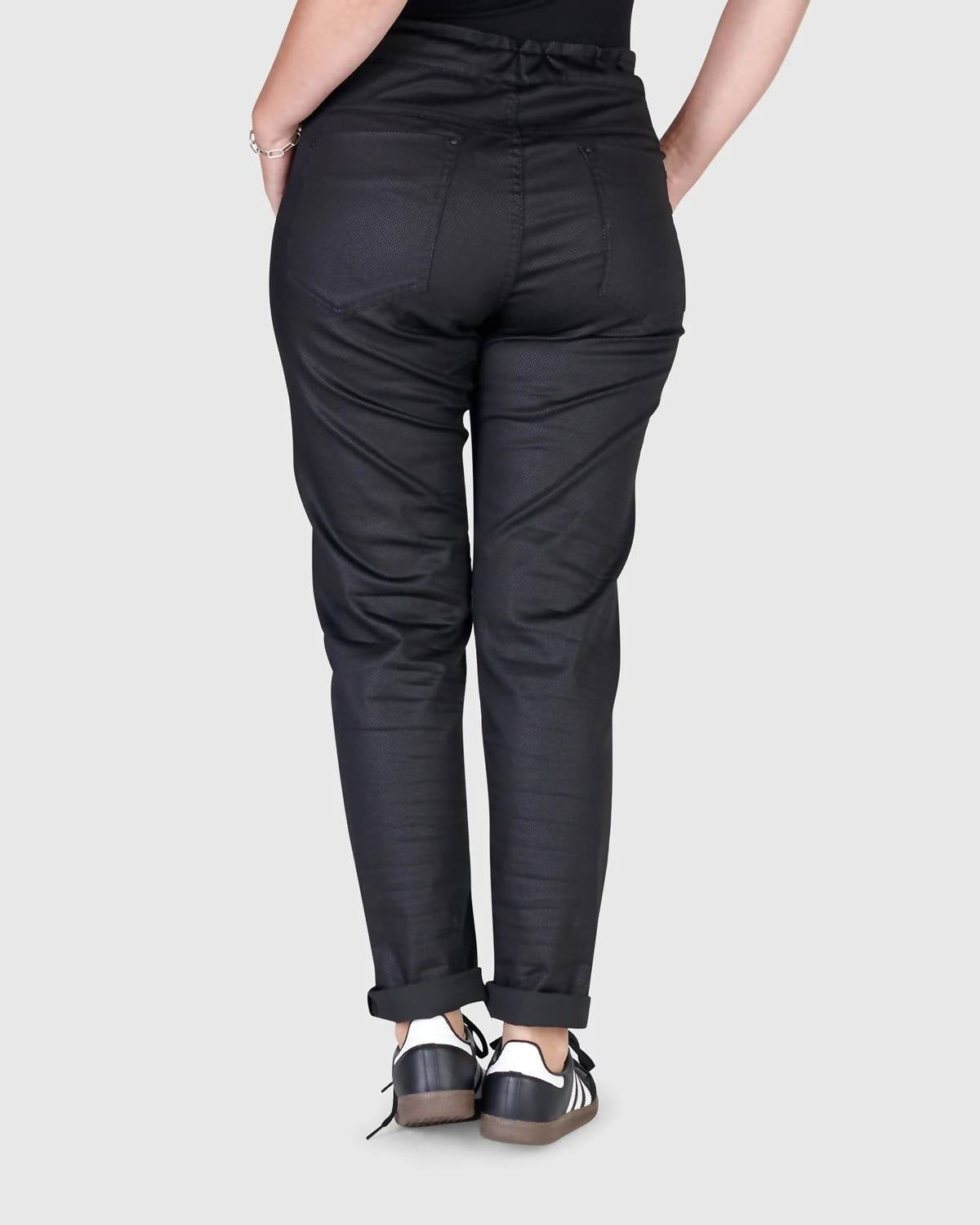 The perfect skinny pant for those stylish boots this season! Introducing the Snakeskin Iconic Stretch Jeans by ALEMBIKA, a summer essential that combines comfort with style in a striking black snake pattern. These mid-rise jeans offer a relaxed taper and feature a drawstring waist with a mock fly, complemented by practical side and patch pockets adorned with rivet trim. Crafted from a soft stretch cotton blend of 65% Cotton, 31% Polyester, and 4% Elastane, these jeans are designed and made in Israel. Enjoy the versatility of a skinny leg style perfect for any concert or Halloween event. Plus sizes available to accommodate a variety of body types.
