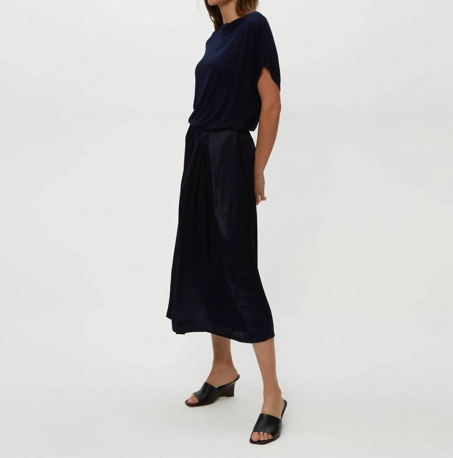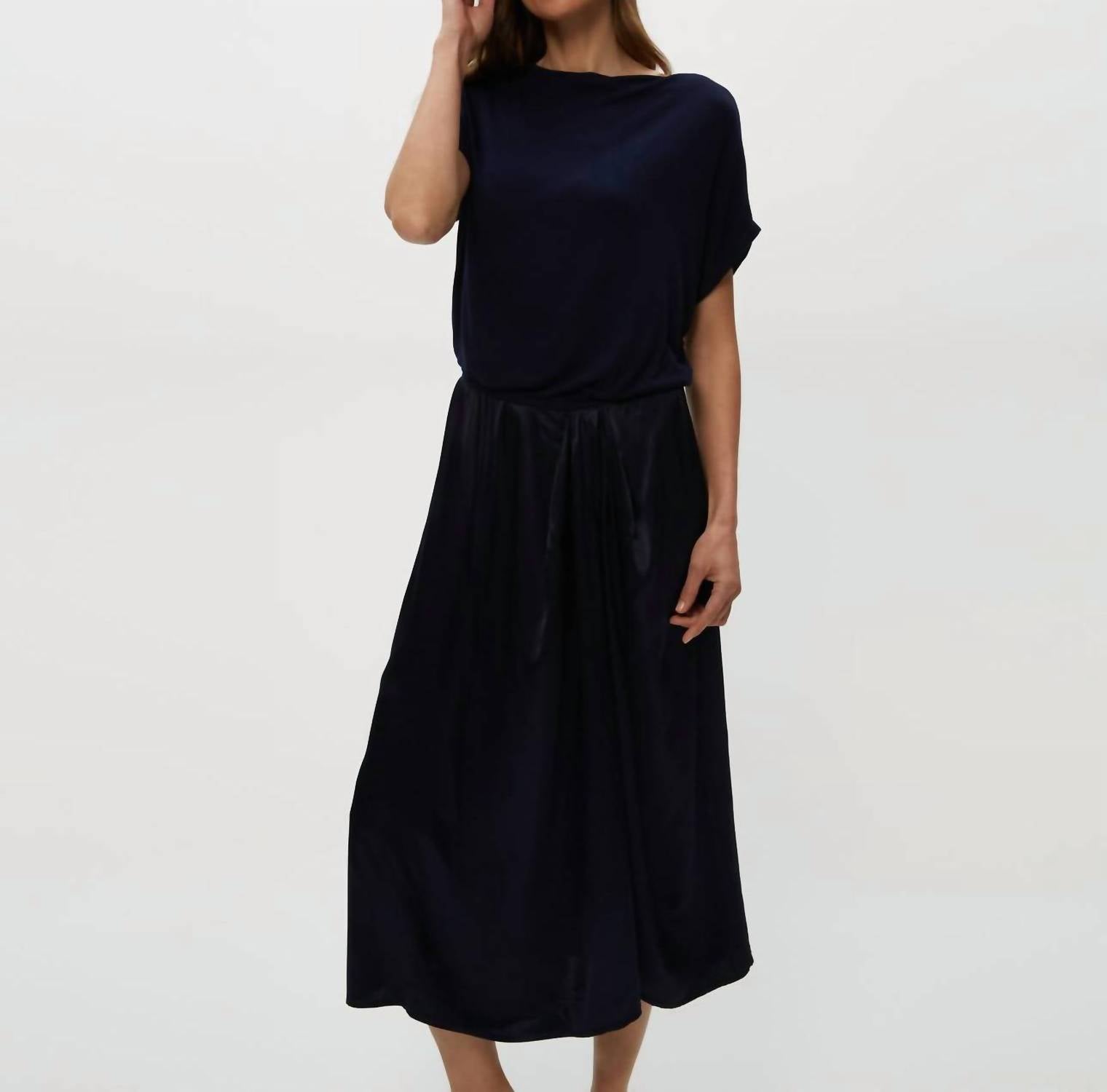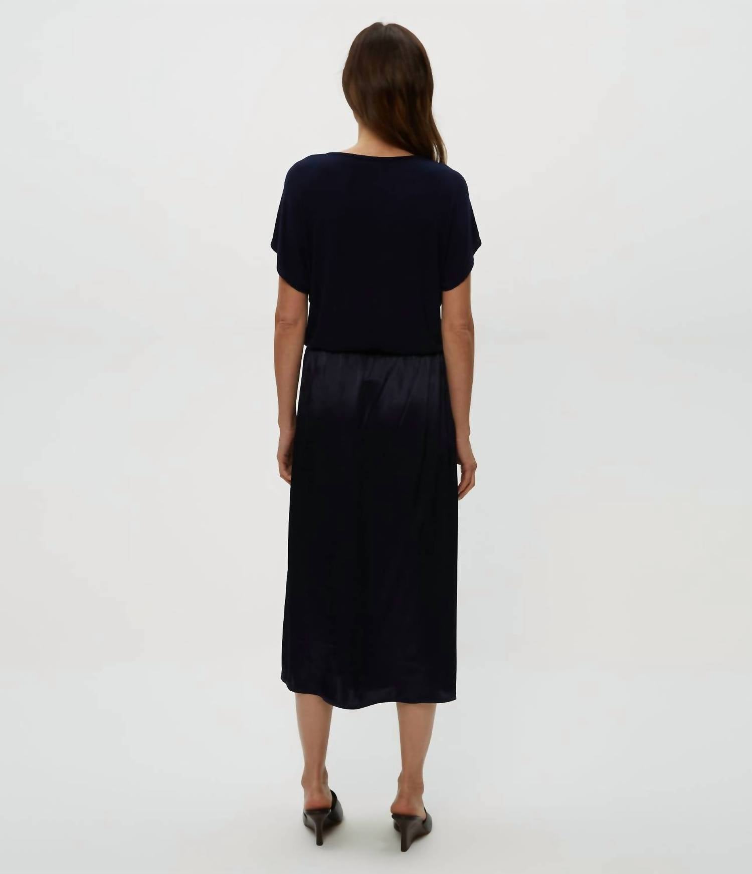 Embrace elegance with the Siobhan Twist Front 2-in-1 Set by Michael Stars, a must-have piece in a rich Nocturnal hue. This women's outfit features a soft, ribbed top with short oversized batwing sleeves and a flowing, perfectly pleated satin skirt, all in a solid pattern. Made from 53% Rayon and 47% Viscose, it combines a boatneck design with a relaxed A-line silhouette for effortless style, extending 48 inches in length. Closure: Pull-on. Care: Machine wash on a gentle cycle and tumble dry low. Perfect for dinner parties or any occasion, embodying the essence of Quiet Luxury this Fall, and a wonderful gift for Mother's Day.