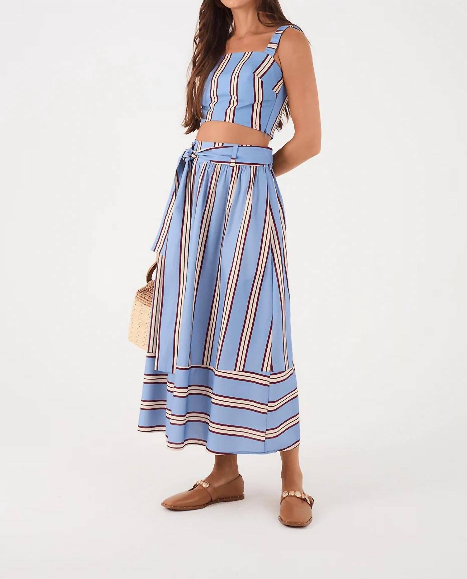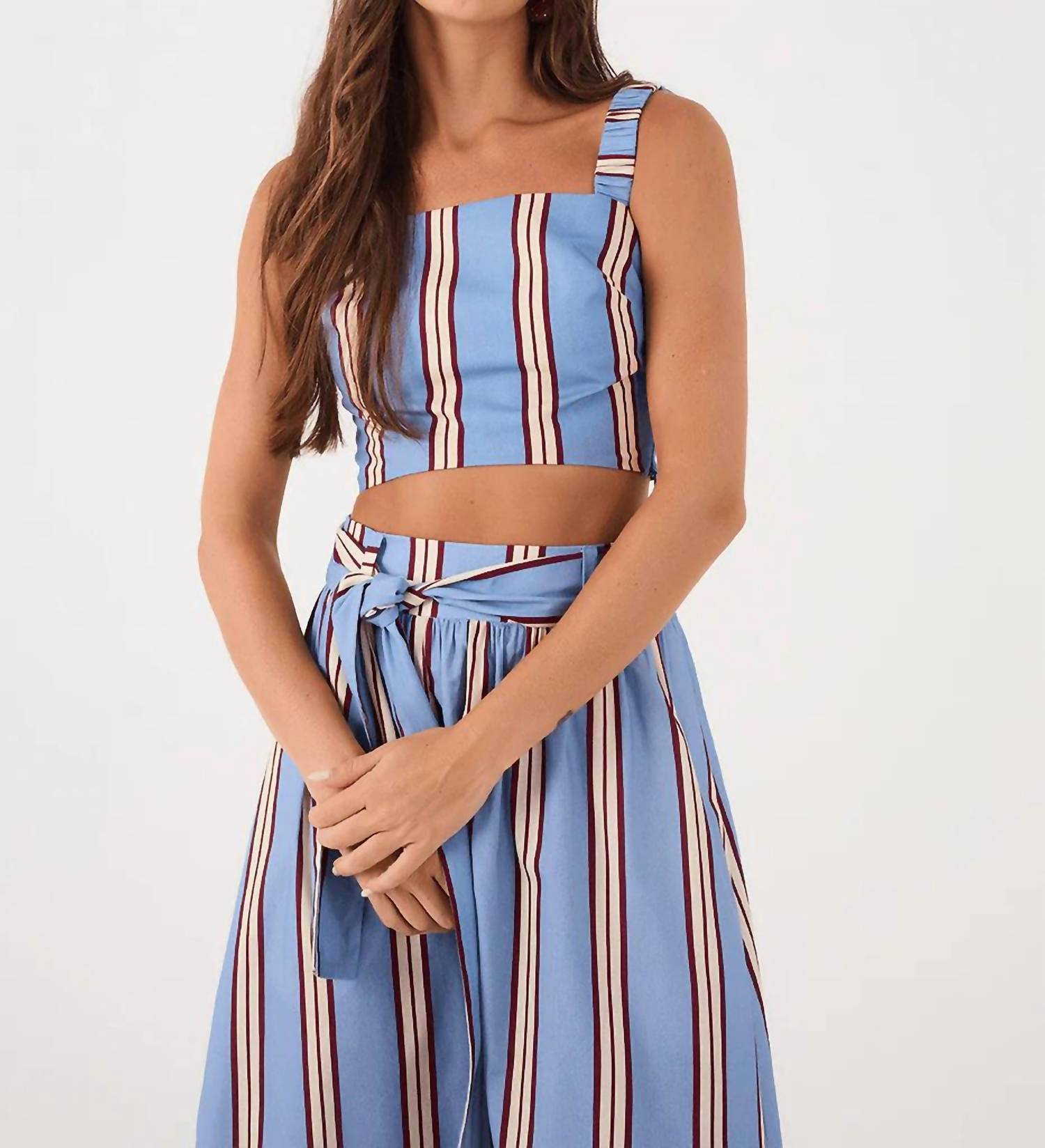 Enhance your wardrobe with the Mirante Top and Skirt Set by Dress To, perfect for Ole Miss girls in striking blue and red stripes. The set includes a crop-length top and a skirt featuring a tie-waist belt, delivering a chic and coordinated look. Designed for comfort and style, it's ideal for various occasions, from spring vacations to festive celebrations.