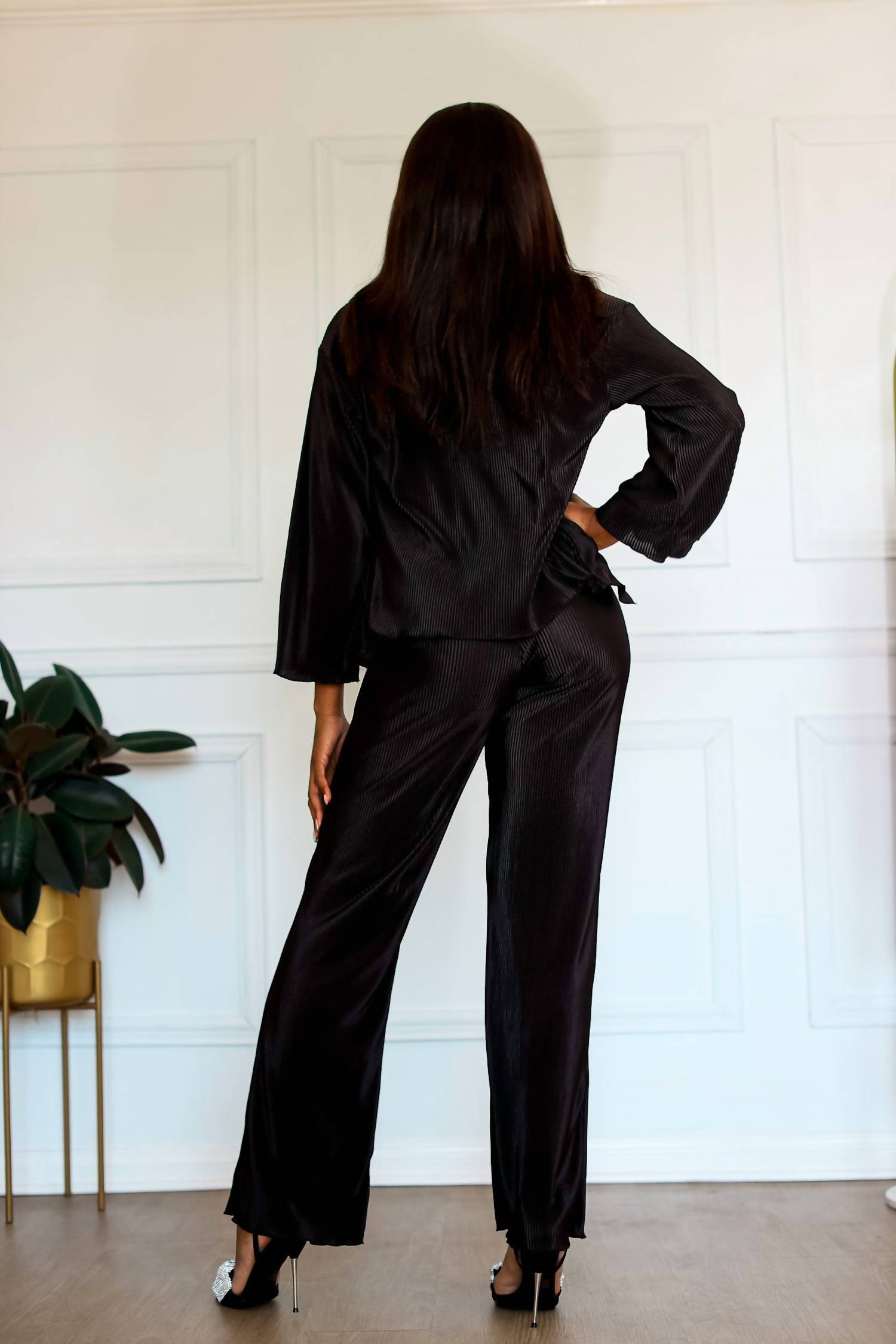 Elevate your wardrobe with the Allure Noire Plisse 3 Piece Set by Little Secret Of Mine in whimsical pleated black. This ensemble boasts a long-sleeved, collared shirt, a front-tie halter neck bralette, and high-waisted pocket pants with a drawstring closure. Crafted from a luxurious blend of 95% Polyester and 5% Spandex, it offers a flattering, form-fitting silhouette perfect for summer occasions. The set combines style and versatility, effortlessly embodying the trend of quiet luxury. Please note the color may vary slightly due to lighting and monitor settings.