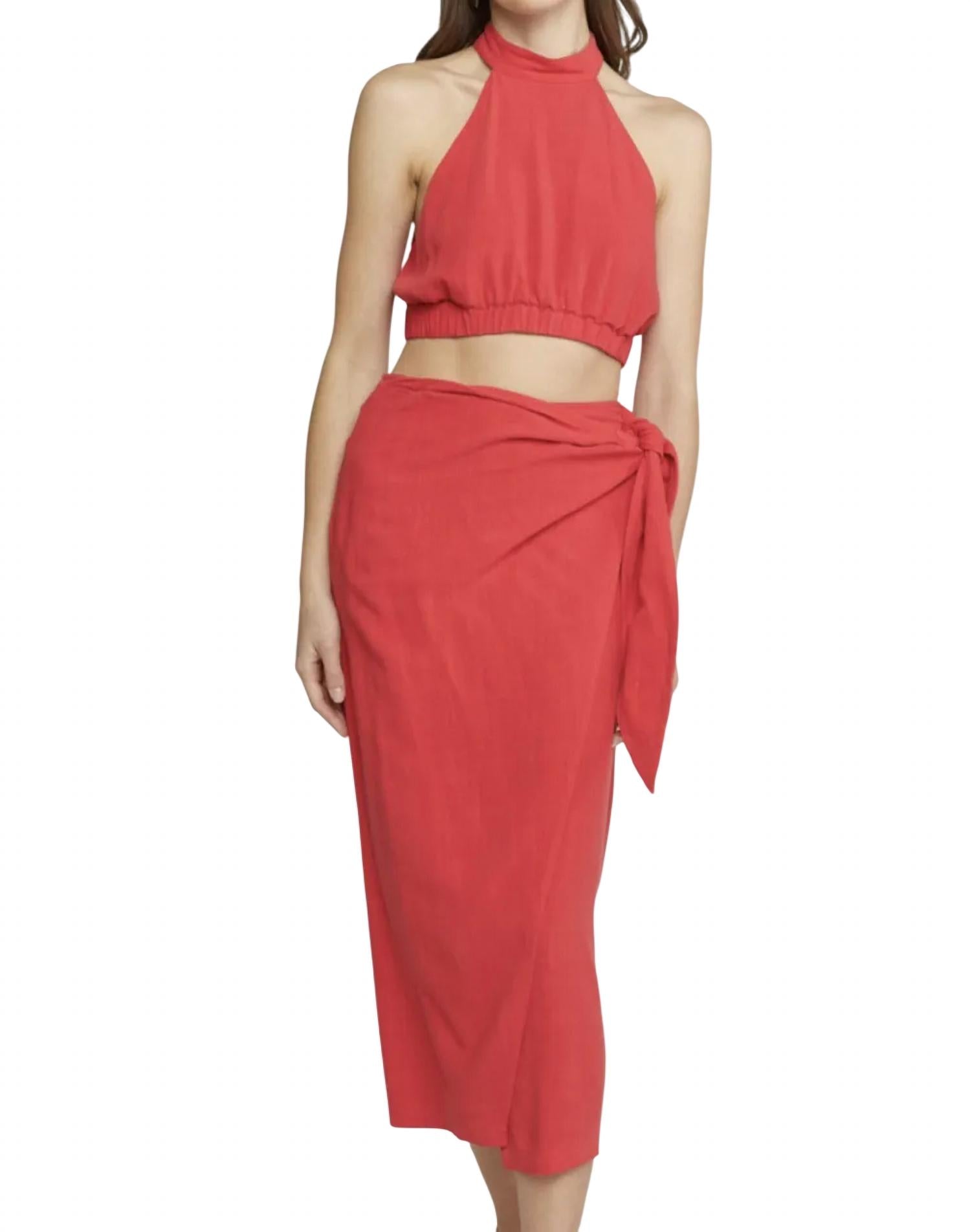 Embrace beach day elegance with the Entro Top and Sarong Set in a stunning red. This set includes a sleeveless mock neck cropped top with an open back and a chic red sarong midi skirt featuring a stylish front slit. Both pieces are lined for comfort and finished with a practical button closure at the neck and an invisible button closure inside the skirt. To maintain its vibrant color and minimalist appeal, hand wash and line dry.