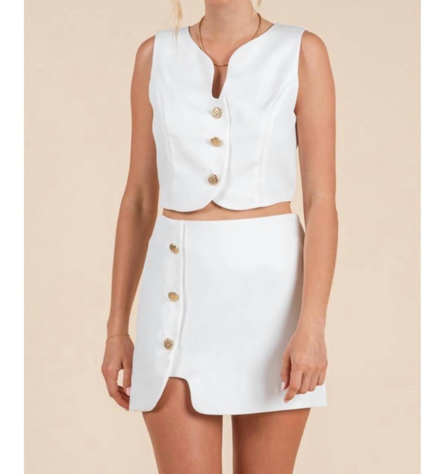 Elevate your spring wardrobe with the Wavy Top & Skirt Set by BABY PINK, tailored for the modern woman. This chic ensemble in timeless white features a wavy hemline crop top paired with a matching skirt, accented by gold button details. The back zipper closure ensures a seamless fit while both pieces are fully lined for comfort. Care for this solid-patterned set by dry cleaning to maintain its quiet luxury appeal perfect for cocktail parties or romantic Valentine's Day occasions.