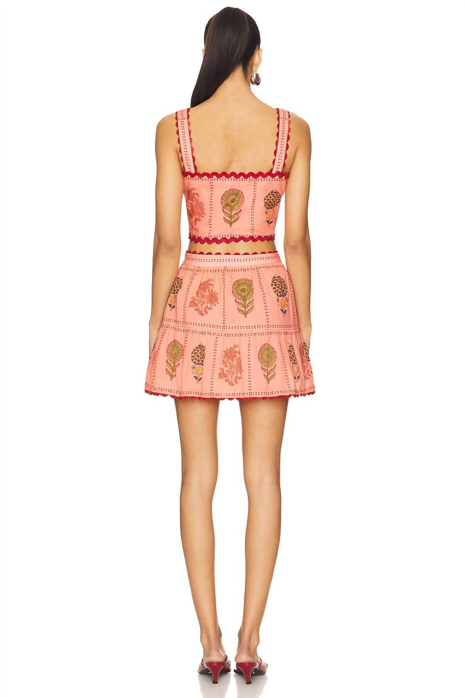 Introducing the Silas Top and Skirt Set by SAYLOR, crafted for sophisticated elegance in a lively pink floral pattern. This sleeveless set features a flattering crop top with a side zipper closure paired with a chic mini skirt, both fully lined with 100% cotton for comfort. Imported from India, this set is perfect for summer occasions, effortlessly transitioning from day to night. Care: Dry clean only. Model is 5'11" and wears a size x-small.