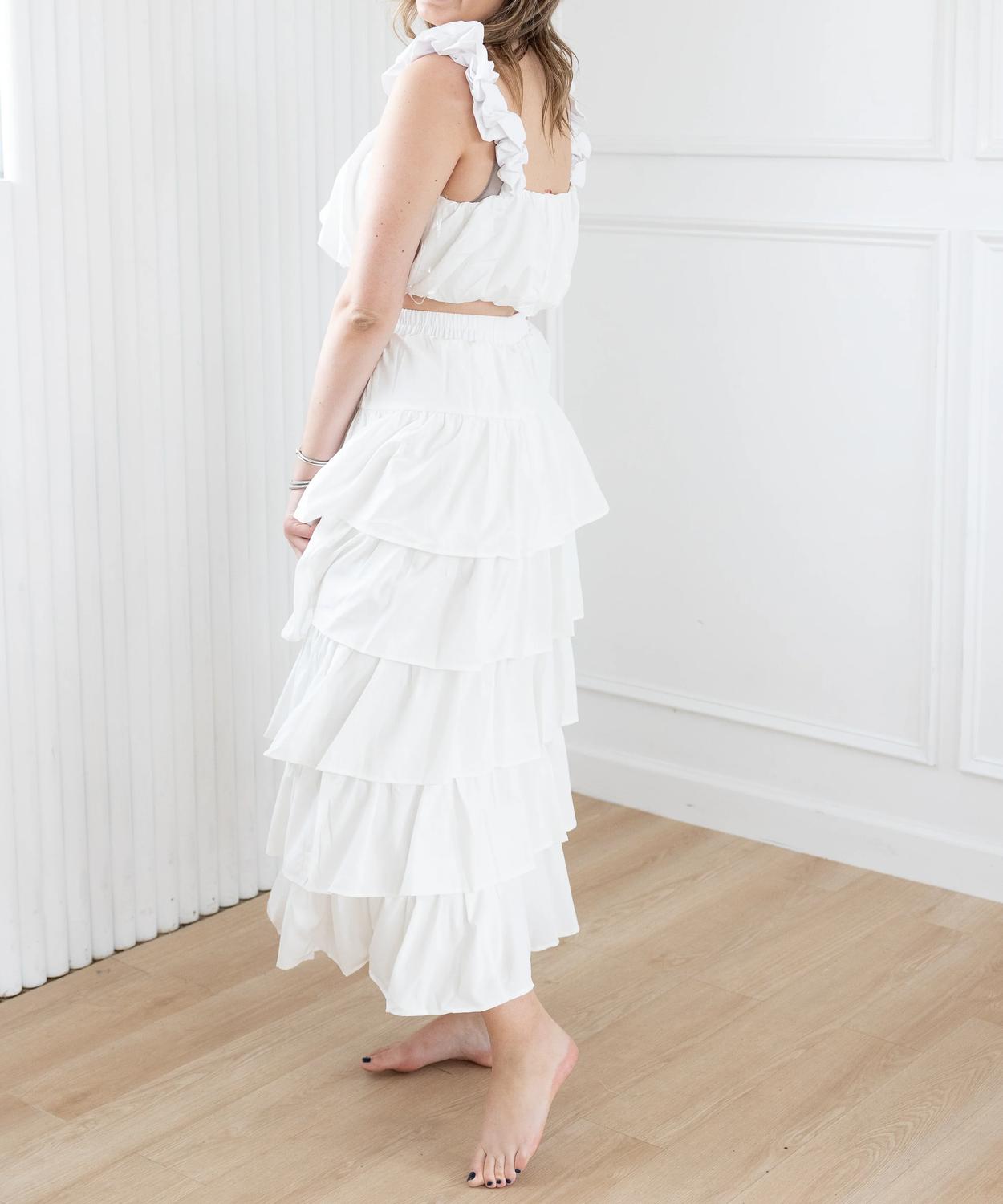 Experience effortless summer style with the Entro Crop Top & Skirt Set in elegant white. This minimalist ensemble features a puff sleeve crop top paired with a high-waisted tiered maxi skirt, completing a chic look perfect for vacation. The skirt offers a convenient pull-on closure, with an elastic waistband at the back for a comfortable fit. Care is simple with hand wash and line dry instructions, making it a practical choice for your seasonal wardrobe.