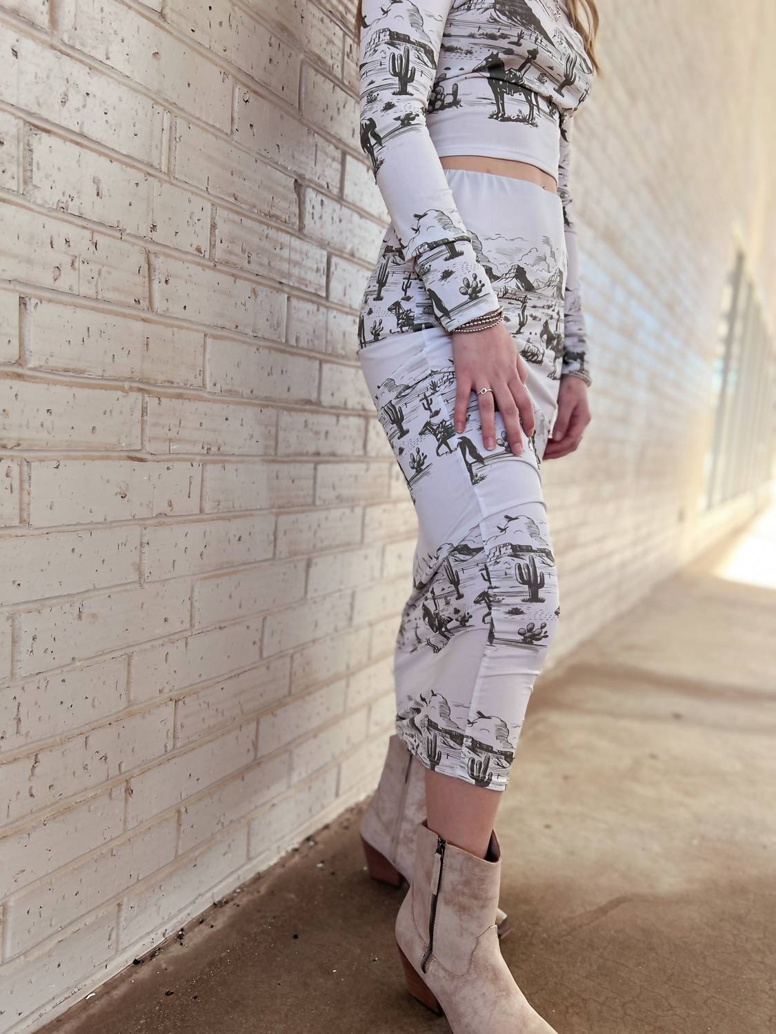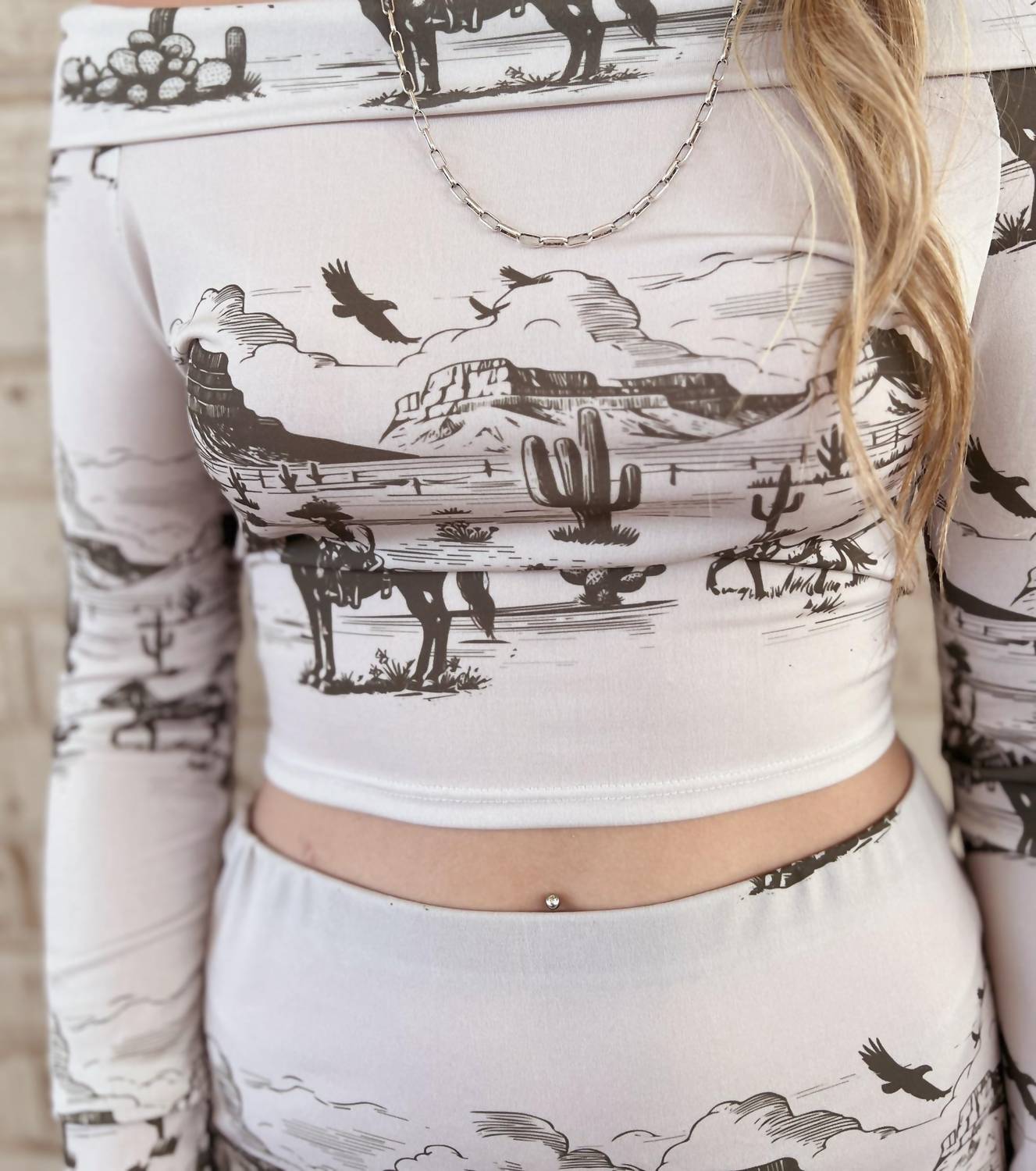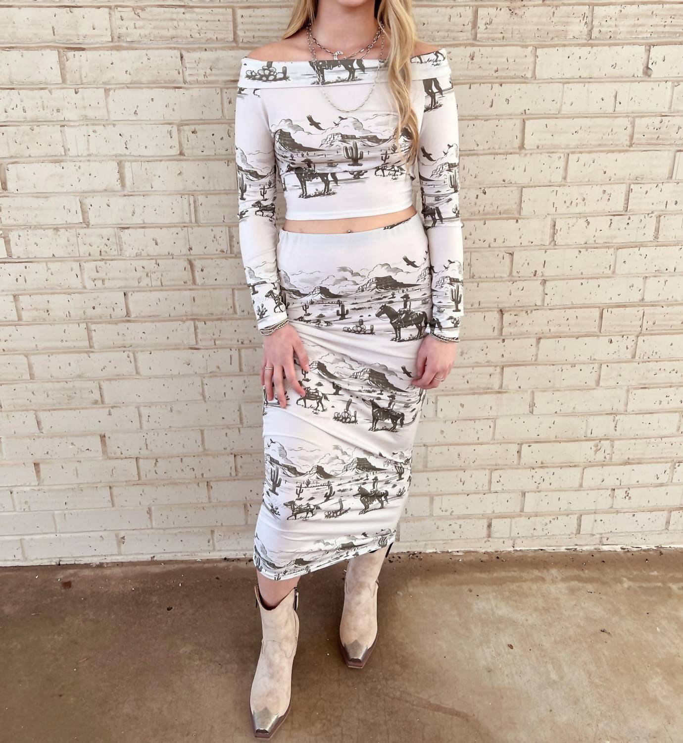 Introducing the Western Desert Top and Midi Skirt Set by L&B Creations, a chic outfit in ivory crafted for a bold statement. This ensemble features long sleeves and an alluring off-the-shoulder neckline, composed of 95% polyester and 5% spandex for a comfortable fit. The set includes a crop top and a pencil midi skirt with a striking animal print, embodying a Western trend perfect for a Thanksgiving costume party. Closure type: Pull on.
