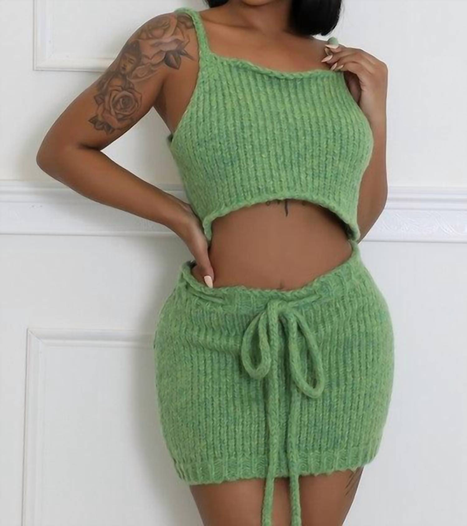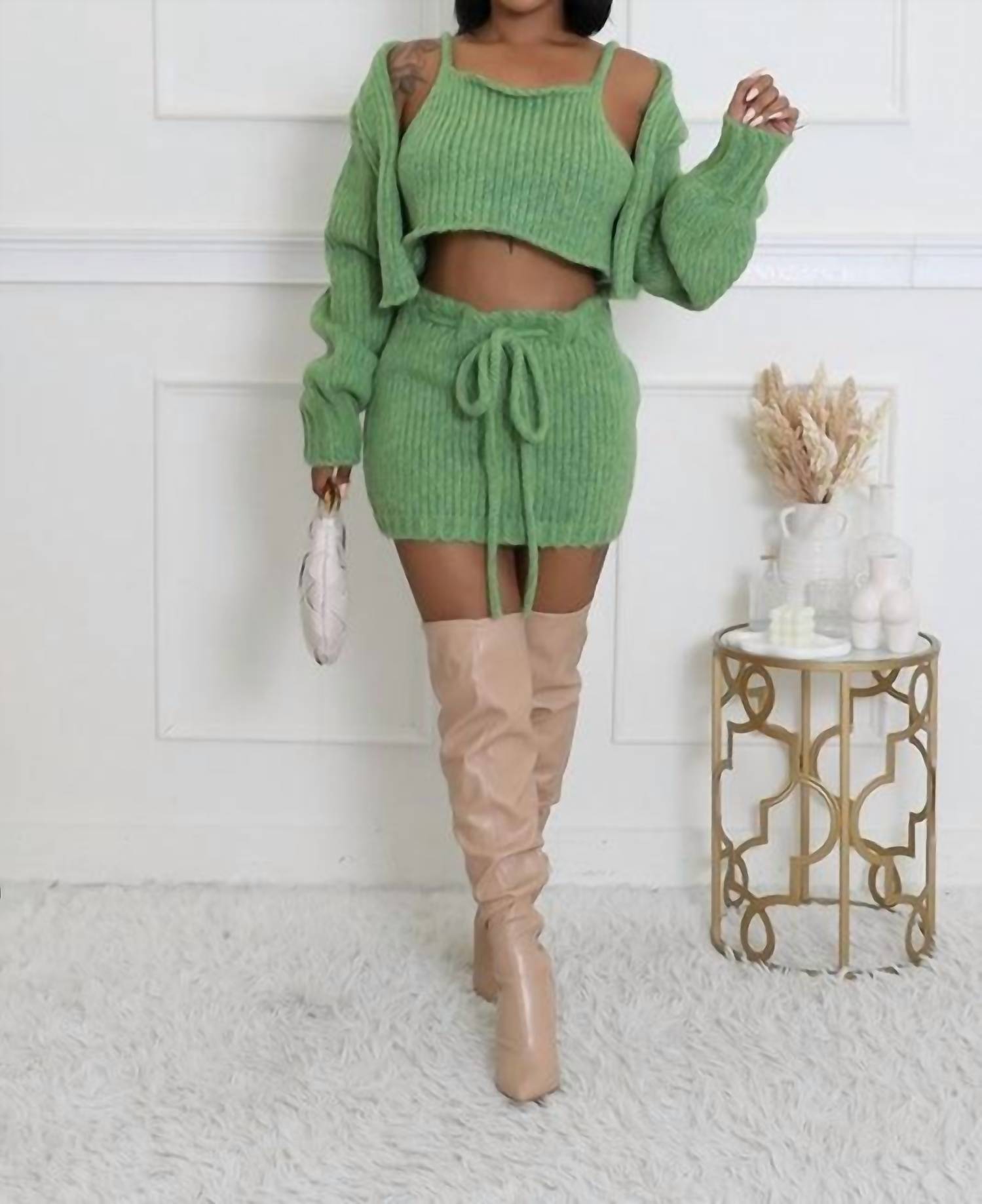 The Knit Me Baby One More 3-piece Set by Little Secret Of Mine is a charming ensemble designed for both comfort and style. This solid green, minimalist-inspired set includes a cropped cardigan with stretchy knit fabric and spaghetti strap top, paired with a high-waisted skirt featuring an elastic waistband and adjustable drawstrings. Composed of 100% polyester, it offers a true-to-size fit perfect for any summer beach day. Closure: Pull-on design. Care: Hand wash cold. Perfect for celebrating occasions like the 4th of July.
