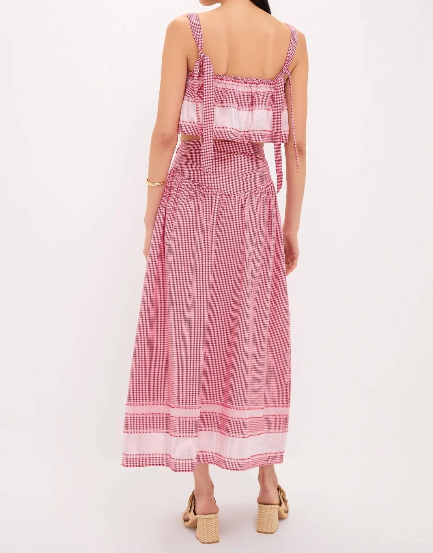 Introducing the Red and White Judy Skirt Set by SAYLOR, a summer-ready ensemble perfect for sunny adventures. This women's set features a strapless smocked crop top and a midi-length drop waist skirt in a gingham pattern, bringing a boho chic vibe to your wardrobe. Made from 100% Cotton, this shift silhouette set is designed for comfort and style. Closure: Pull on. Care: Dry clean only. Ideal for vacation or a festive 4th of July celebration.