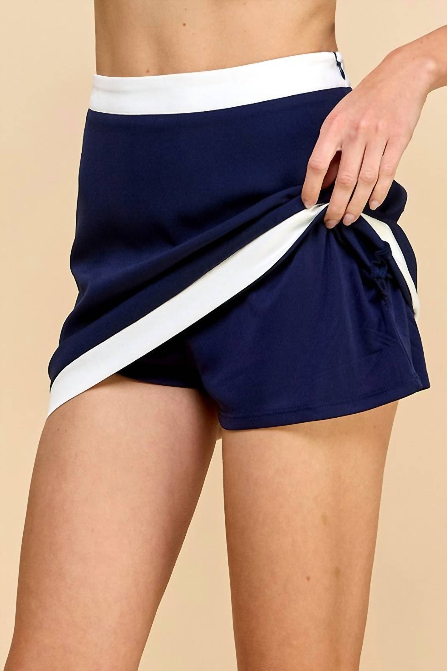 Elevate your athleisure wardrobe with the Natalia Two Piece Set by TCEC, a stylish combination of a cropped tank and skort designed for active women. With a composition of 95% Polyester and 5% Spandex, this solid navy blue set ensures both comfort and flexibility. The set features a side zipper closure and is ideal for fitness or casual outings. Care instructions recommend hand washing and line drying. The model at 5'9" wearing a size Small.