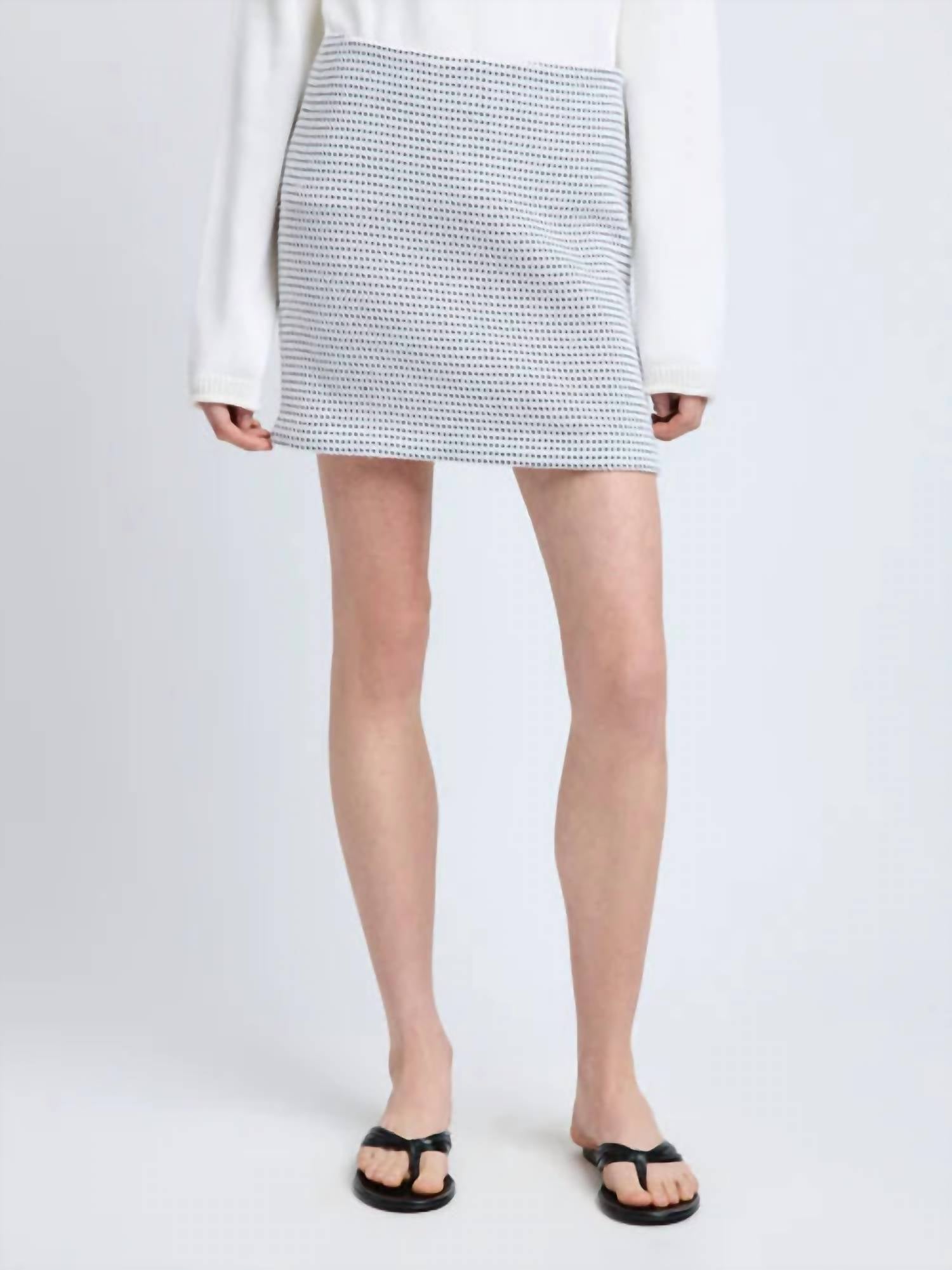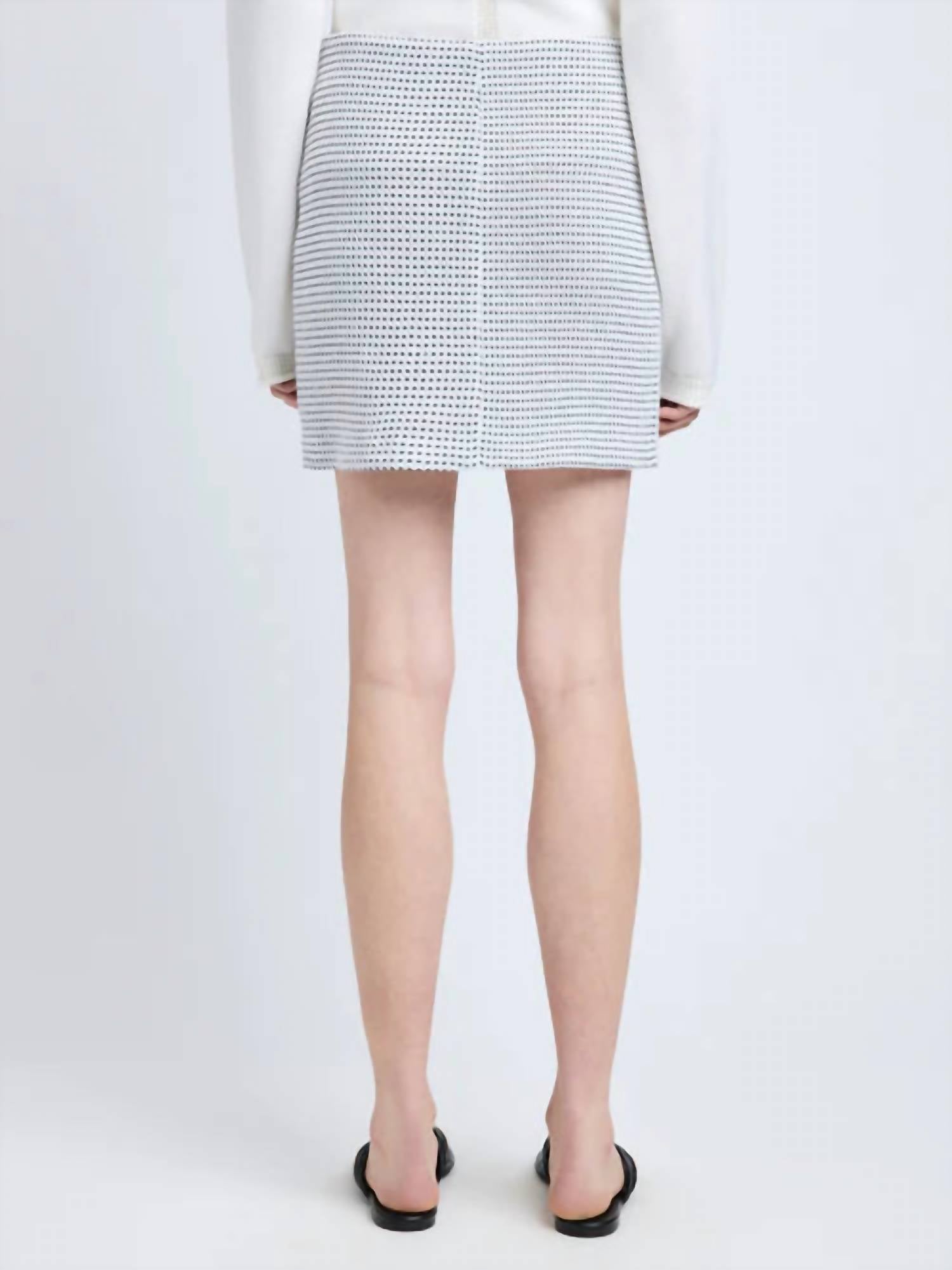 This asymmetrical skirt shows just the right amount of leg. Elevate your holiday party ensemble with the Lawson Skirt by Proenza Schouler. This slim-fit, high-waisted mini skirt in two-tone tweed is perfect for spring, featuring a tailored silhouette and a chic off-white hue. Made from 54% polyamide, 32% cotton, and 14% polyester, it offers a luxuriously patterned appeal and is completed with a concealed zip closure. Originating from meticulous craftsmanship, caring for this stylish piece is a breeze with its dry clean-only instructions.