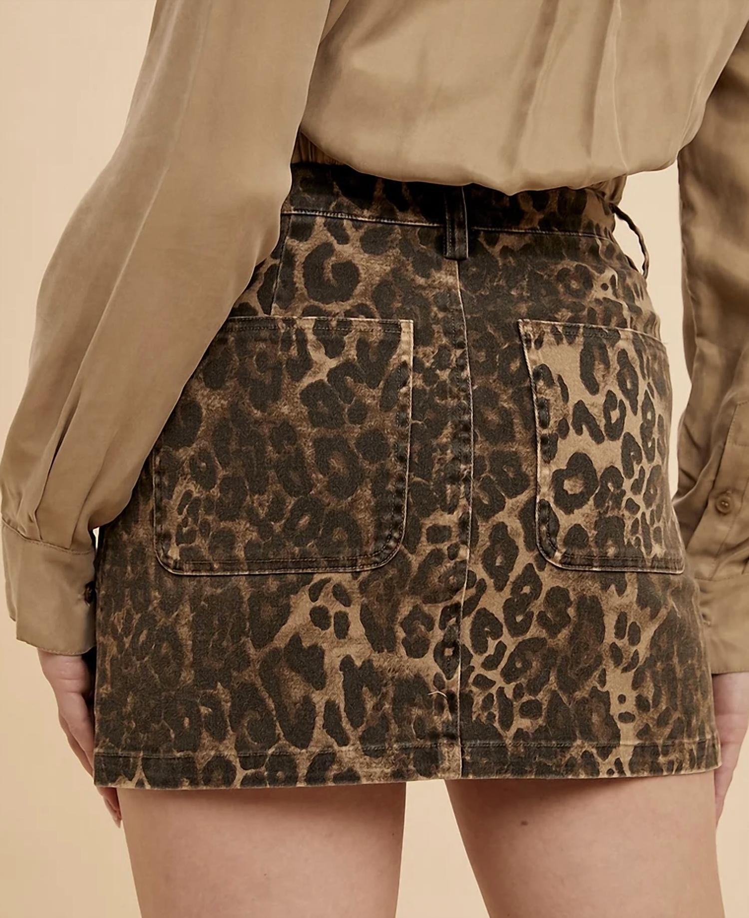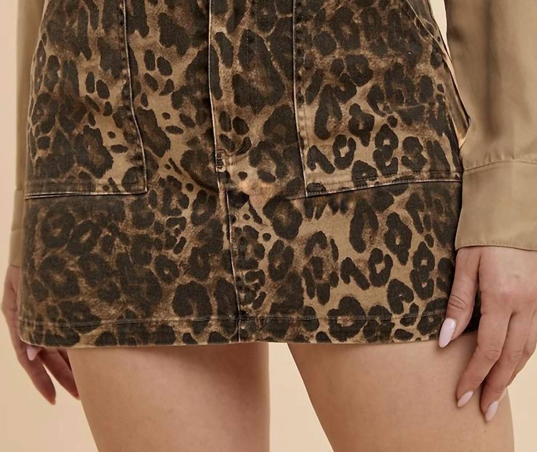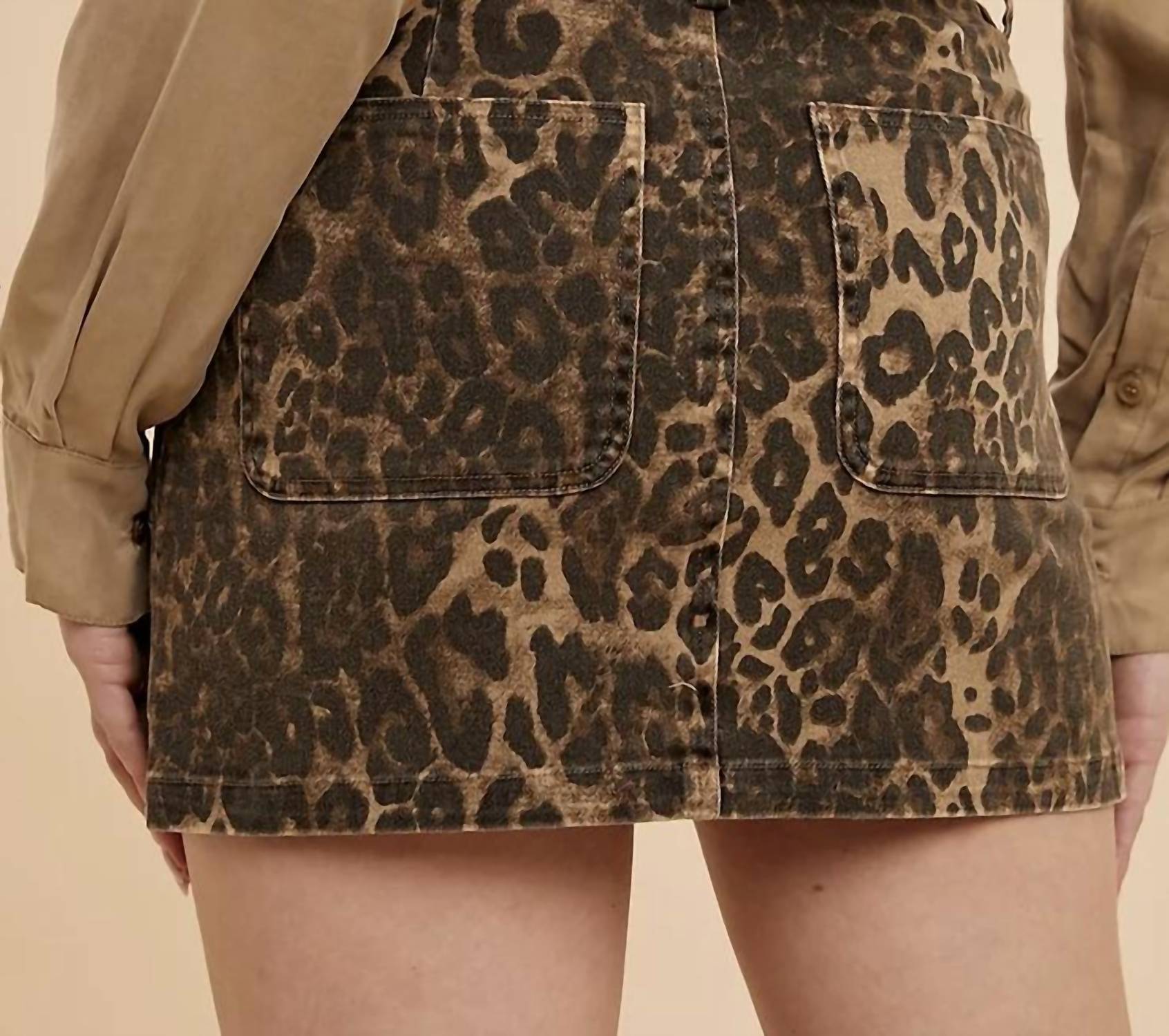 Leopard-spotted denim. High-waist mini skirt. Belt loops. Zip fly and button closure. Four-pocket styling. 98% cotton, 2% polyurethane. Machine wash cold. Made in Italy.