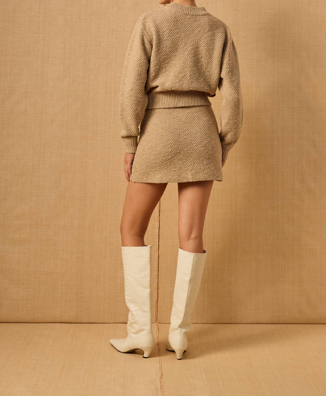 Show just the right amount of leg in this fit flattering mini. Elevate your wardrobe with the Pier Knit Skirt by MON RENN, a textured mini skirt in taupe perfect for versatile styling. This fully fashioned knitwear piece features a body fit and is designed to be worn mid to high waisted with an internal waist elastic for added adjustability. Composition: 60% Cotton, 40% Nylon. Closure: Pull-on style. Care instructions: Hand wash and lay flat to dry.